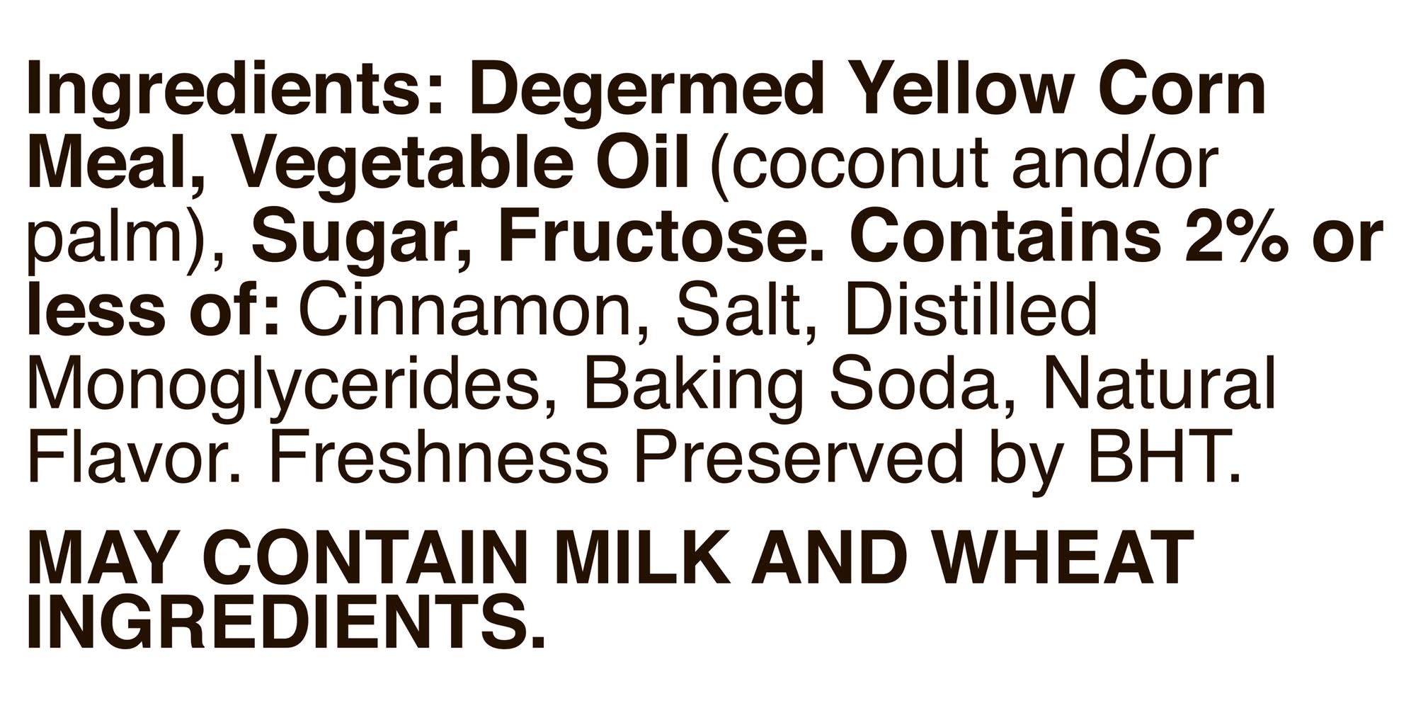 Ingredients: Degermed Yellow Corn Meal, Vegetable Oil (Coconut and/or Palm), Sugar, Fructose, Contains 2% or Less of: Cinnamon, Salt, Distilled Monoglycerides, Baking Soda, Natural Flavor, Freshness Preserved by BHT Contains: Milk, Wheat
