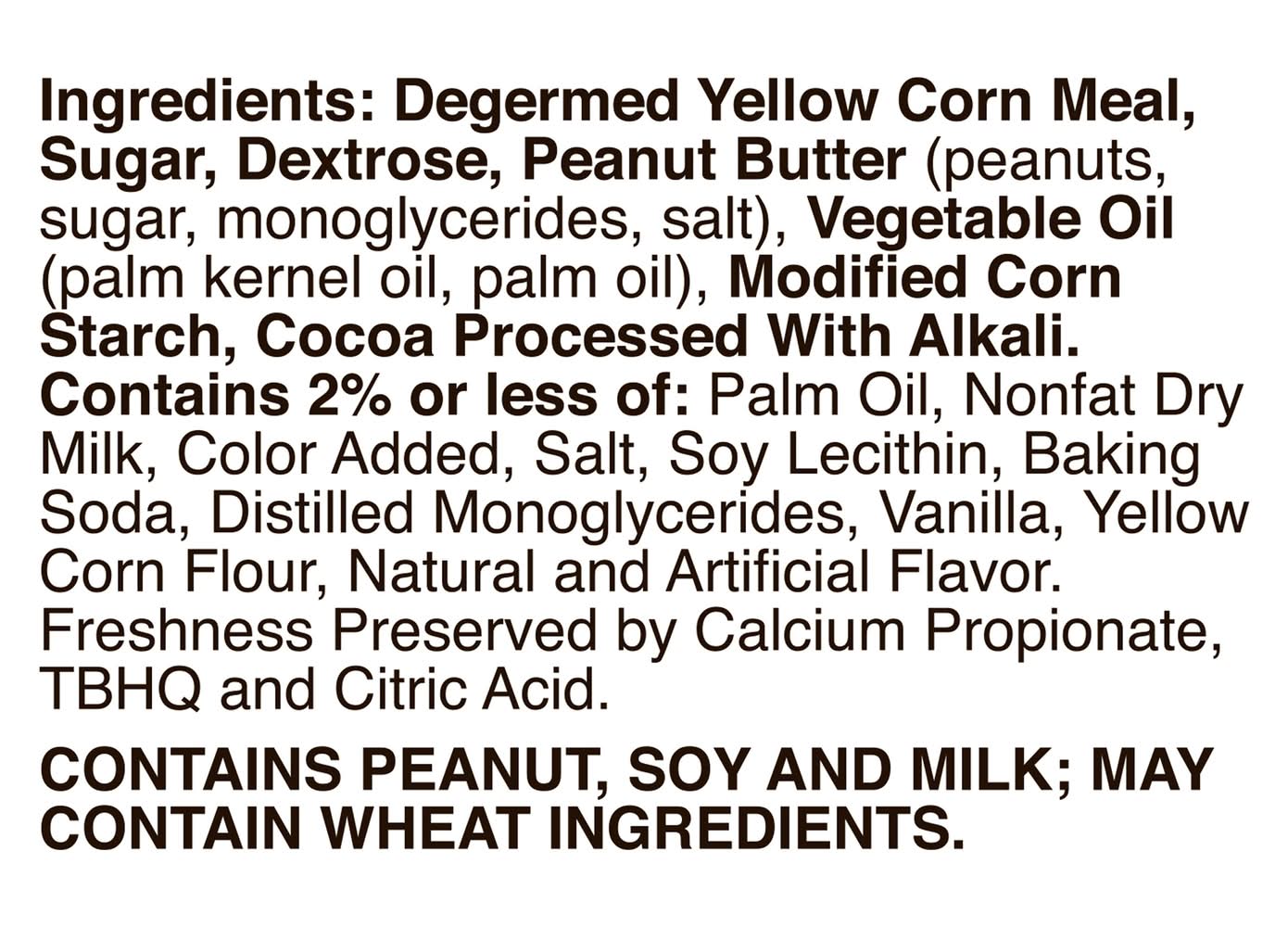 Ingredients: Degermed Yellow Corn Meal, Sugar, Dextrose, Peanut Butter (Peanuts, Sugar, Monoglycerides, Salt), Vegetable Oil (Palm Kernel Oil, Palm Oil), Modified Corn Starch, Cocoa Processed with Alkali, Contains 2% or Less of: Palm Oil, Nonfat Dry Milk, Color Added, Salt, Soy Lecithin, Baking Soda, Distilled Monoglycerides, Vanilla, Yellow Corn Flour, Natural and Artificial Flavor, Freshness Preserved by Calcium Propionate, TBHQ and Citric Acid Contains: Peanuts, Soybeans, Milk, Corn, Wheat