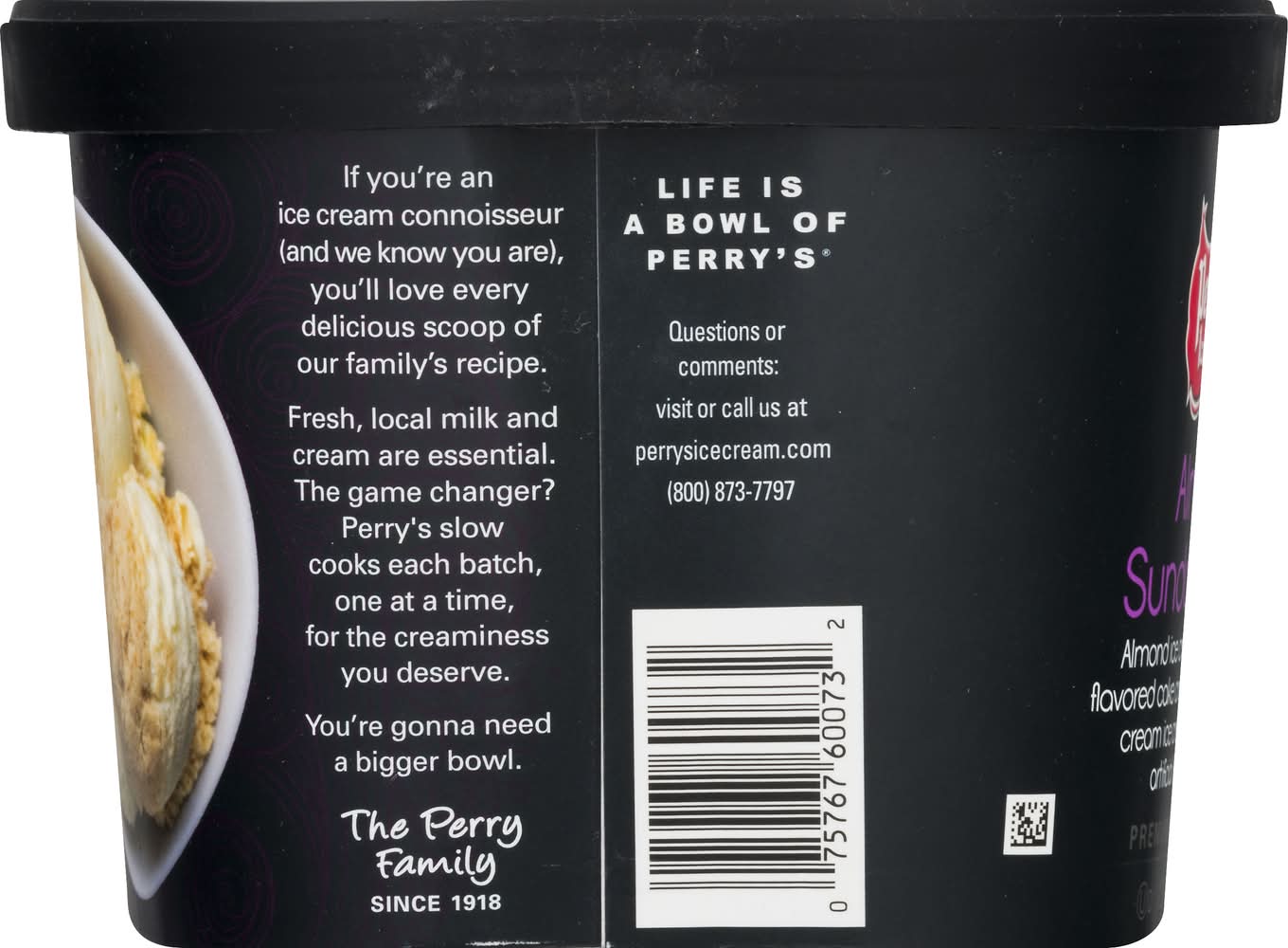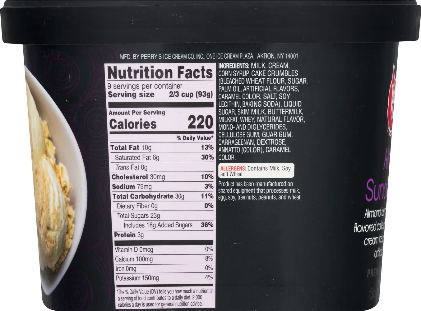 Almond ice cream with almond flavored cake crumbles and whipped cream ice cream in the center. Artificial flavor added. If you're an ice cream connoisseur (and we know you are), you'll love every delicious scoop of our family's recipe. Fresh, local milk and cream are essential. The game changer? Perry's slow cooks each batch, one at a time, for the creaminess you deserve. You're gonna need two scoops. - The Perry Family since 1918. Life is a bowl full of Perry's. perrysicecream.com. Questions or comments: visit or call us at perrysicecream.com (800) 873-7797. Flavor: Almond