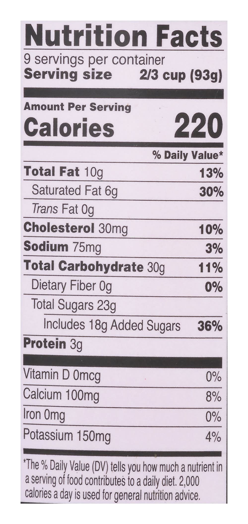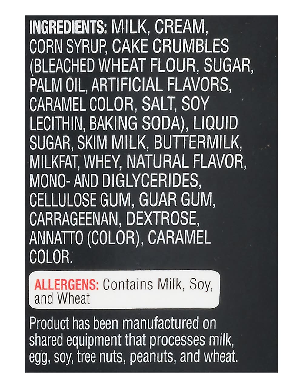 Ingredients: Milk, Cream, Corn Syrup, Cake Crumbles (Bleached Wheat Flour Sugar Palm Oil Artificial Flavors Caramel Color Salt Soy Lecithin Baking Soda), Liquid Sugar, Skim Milk, Buttermilk, Milkfat, Whey, Natural Flavor, Mono- and Diglycerides, Cellulose Gum, Guar Gum, Carrageenan, Dextrose, Annatto (Color), Caramel Color Contains: Milk, Soybeans, Wheat, Milk, Eggs, Soybeans, Tree Nuts, Peanuts, Wheat