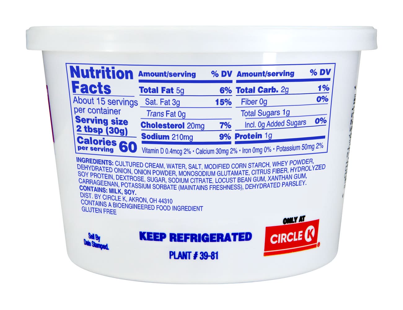 Ingredients: Cultured Cream, Water, Salt, Modified Corn Starch, Whey Powder, Dehydrated Onion, Onion Powder, Monosodium Glutamate, Citrus Fiber, Hydrolyzed Soy Protein, Dextrose, Sugar, Sodium Citrate, Locust Bean Gum, Xanthan Gum, Carrageenan, Potassium Sorbate (Maintains Freshness), Dehydrated Parsley Contains: Soybean and its Derivatives, Milk and its derivates