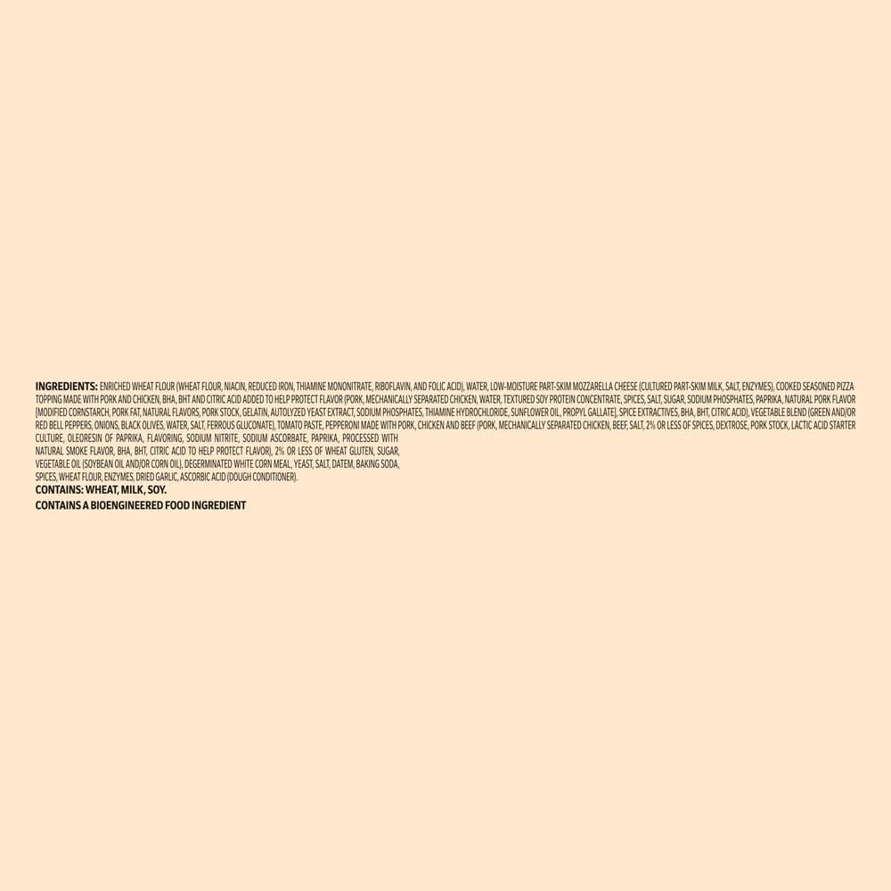 Ingredients: Enriched Wheat Flour (Wheat Flour, Niacin, Reduced Iron, Thiamine Mononitrate, Riboflavin, and Folic Acid), Water, Low-Moisture Part-Skim Mozzarella Cheese (Part-Skim Milk, Cheese Culture, Salt, Enzymes), Cooked Seasoned Pizza Topping made with Pork and Chicken, BHA, Tomato Paste, Red and/or Green and/or Yellow Bell Peppers, Pepperoni made with Pork, Chicken and Beef (Pork, Mechanically Separated Chicken, Beef, Salt, contains 2% or less of Spices, Dextrose, Pork Stock, Lactic Acid Starter Culture, Oleoresin of Paprika, Flavoring, Sodium Nitrite, Sodium Ascorbate, Paprika, processed with Natural Smoke Flavor, BHA, BHT, Citric Acid to help protect flavor), 2% or less of Wheat Gluten, Sugar, Onions, Vegetable Oil (Soybean Oil and/or Corn Oil), Black Olives, Degerminated White Corn Meal, Yeast, Salt, DATEM, Baking Soda Spices, Wheat Flour, Enzymes, Dried Garlic, Ascorbic Acid (Dough Conditioner) Contains: Wheat, Milk, Soybeans, Corn, Gluten Additives: Genetically Modified Ingredients