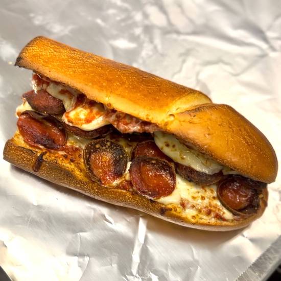 Pizza sauce, mozzarella, and pepperoni. Served on a baked plain, seeded, or multigrain roll.