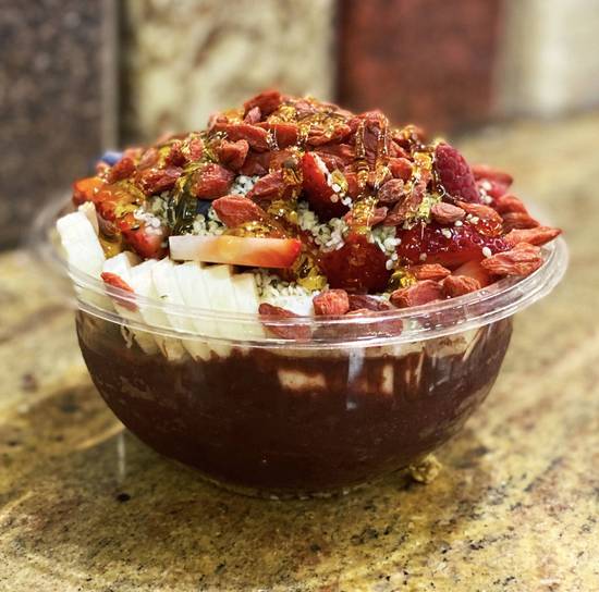 Acai, granola, banana, strawberry raspberry, blueberries, hemp hearts goji berry, and honey.