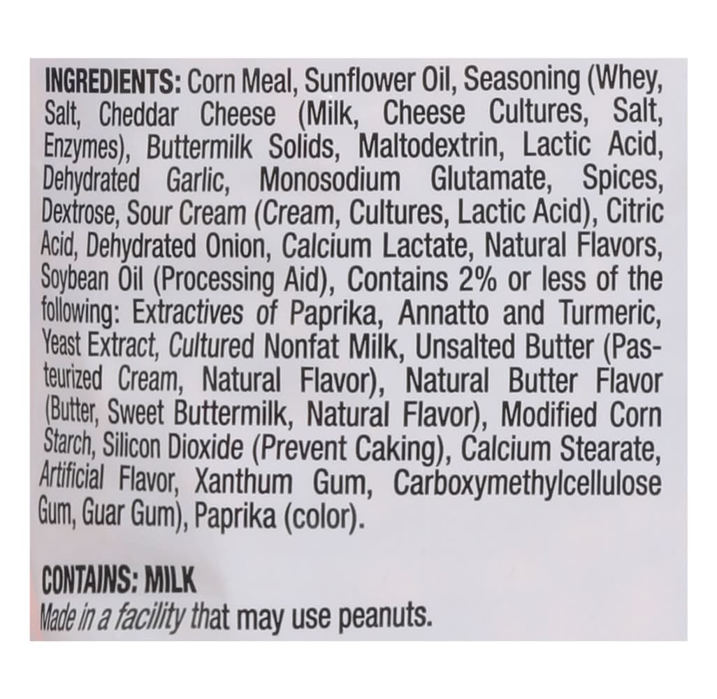 Ingredients: Corn Meal, Sunflower Oil, Seasoning (Whey, Salt, Cheddar Cheese (Milk, Cheese Cultures, Salt, Enzymes), Buttermilk Solids, Maltodextrin, Lactic Acid, Dehydrated Garlic, Monosodium Glutamate, Spices, Dextrose, Sour Cream (Cream, Cultures, Lactic Acid), Citric Acid, Dehydrated Onion, Calcium Lactate, Natural Flavors, Soybean Oil (Processing Aid), Contains 2% or Less of the Following: Extractives of Paprika, Annatto and Turmeric, Yeast Extract, Cultured Nonfat Milk, Unsalted Butter (Pasteurized Cream, Natural Flavor), Natural Butter Flavor (Butter, Sweet Buttermilk, Natural Flavor), Modified Corn Starch, Silicon Dioxide (Prevent Caking), Calcium Stearate, Artificial Flavor, Xanthum Gum, Carboxymethylcellulose Gum, Guar Gum), Paprika (Color) Contains: Milk, Corn, Soybeans, Peanuts