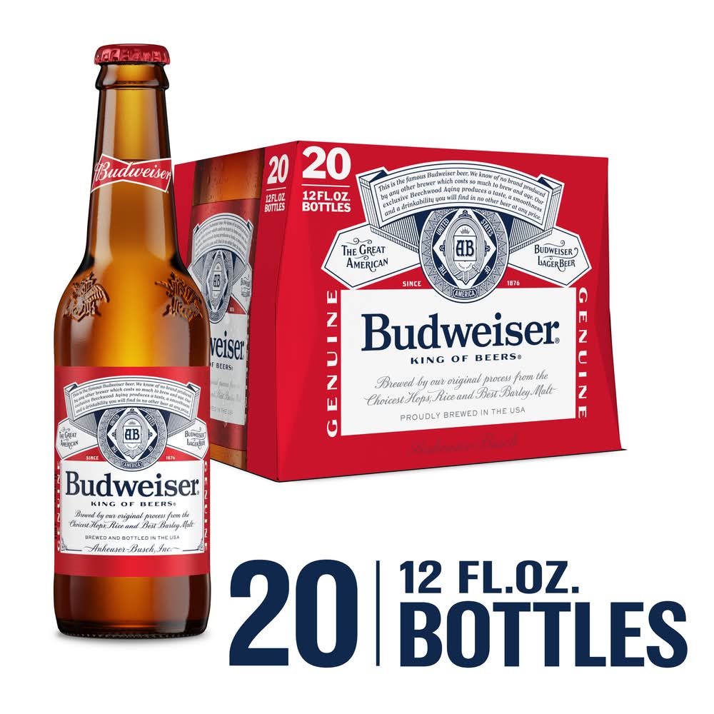 This is a classic domestic beer with a medium body, crisp finish, and full flavor—crafted for easy enjoyment all summer long. Brewed with high-quality barley malt, premium hops, fresh rice, and filtered water, it delivers a clean, balanced taste that never goes out of style. With 145 calories per serving, it’s the perfect cold beer for catching a ballgame, firing up the grill, or kicking back with friends. From burgers and pizza to fried chicken, this beer pairs effortlessly with your favorite foods. Crack one open and make every moment. This Bud's For You. • Brand: Budweiser • Pack size: 20 • Alcohol by volume: 5% • Anheuser Busch, 1 Busch Place, St. Louis, MO 63118, USA • Packaging: Reusable