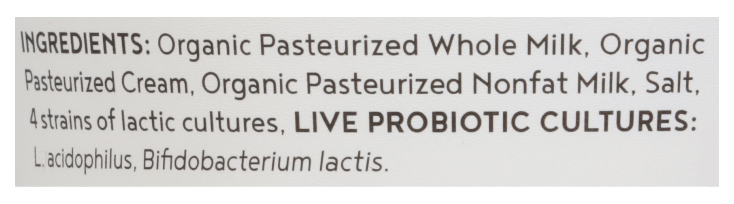 Ingredients: Organic Pasteurized Whole Milk, Organic Pasteurized Cream, Organic Pasteurized Nonfat Milk, Salt, 4 Strains of Lactic Cultures, Live Probiotic Cultures: L. Acidophilus, Bifido Bacterium Lactis Contains: Milk