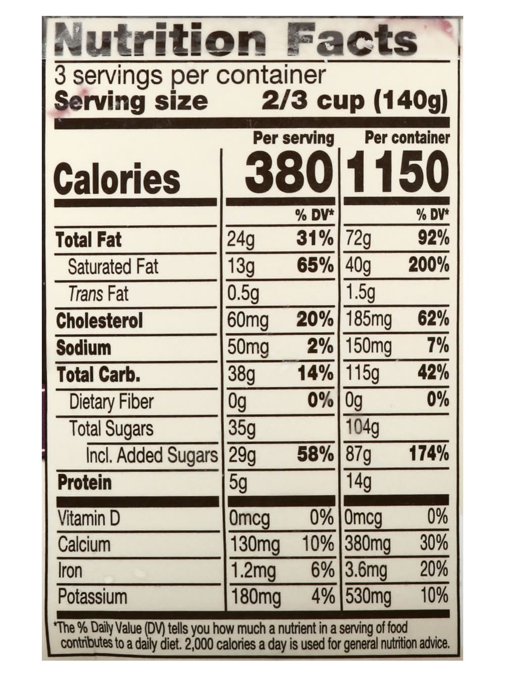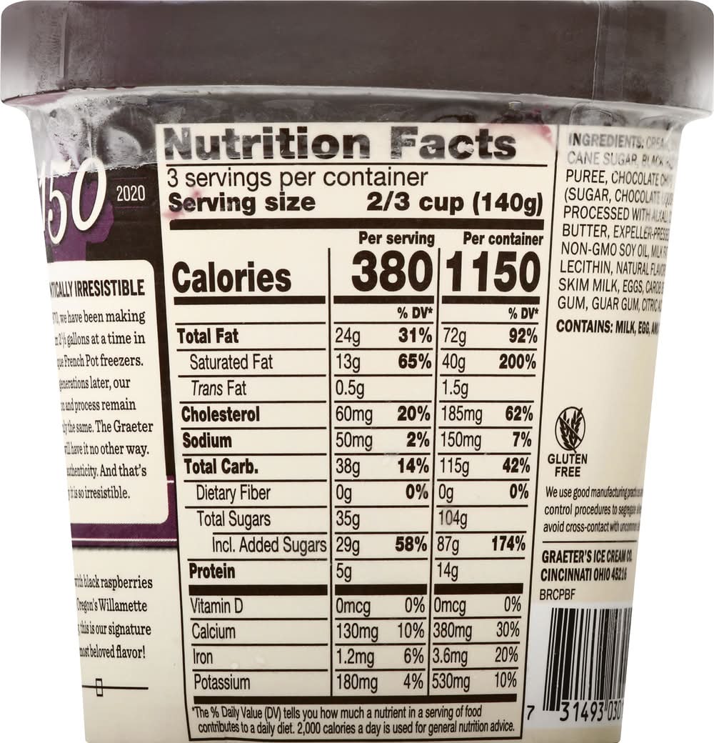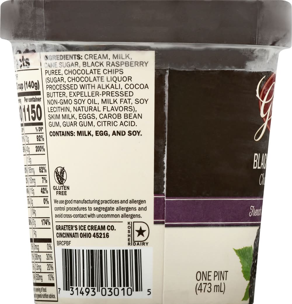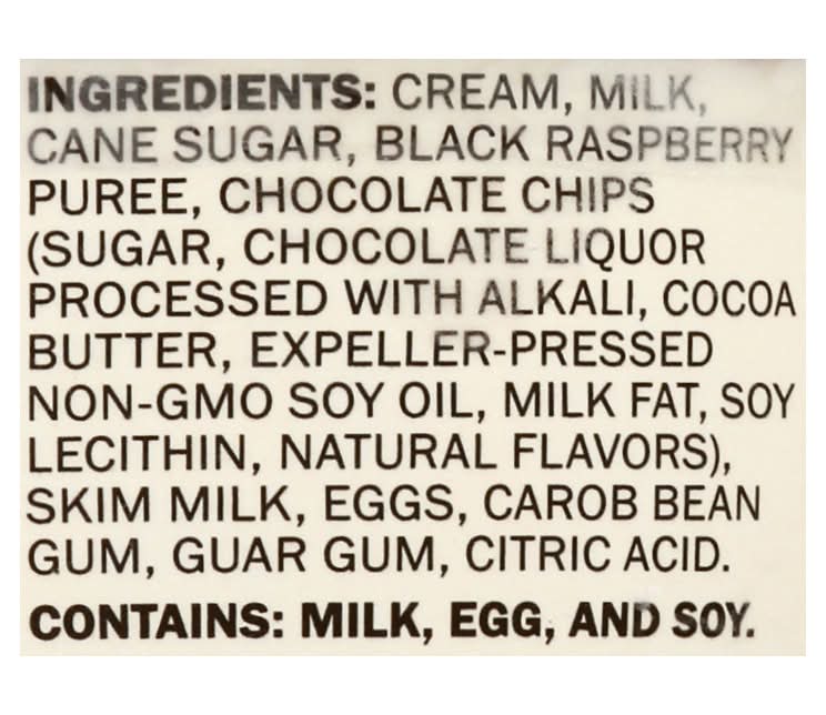 Ingredients: Cream, Milk, Cane Sugar, Black Raspberry Puree, Chocolate Chips (Sugar, Chocolate Liquor Processed with Alkali, Cocoa Butter, Expeller-Pressed Non-GMO Soy Oil, Milk Fat, Soy Lecithin, Natural Flavors), Skim Milk, Eggs, Carob Bean Gum, Guar Gum, Citric Acid Contains: Milk, Eggs, Soybeans