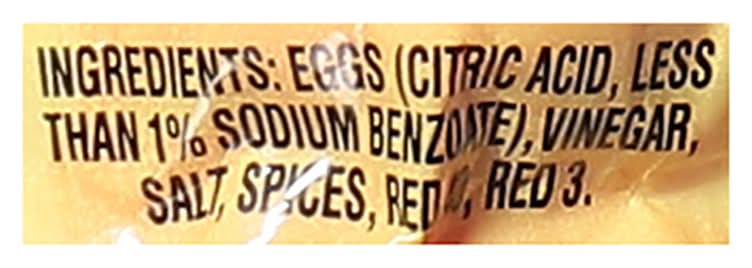 Ingredients: Eggs (Citric Acid, Less than 1% Sodium Benzoate), Vinegar, Salt Spices, Red 40, Red 3 Contains: Eggs