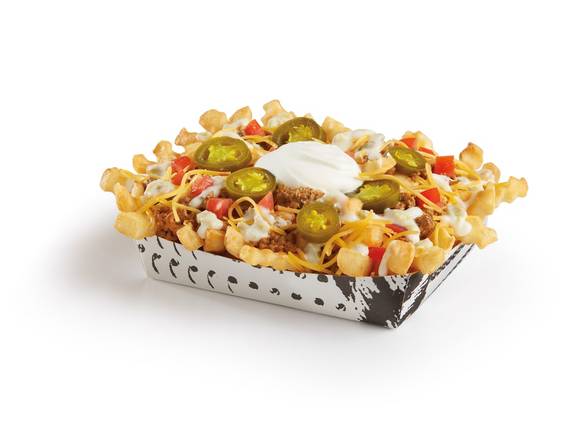 Crinkle Cut Fries topped with seasoned beef, signature creamy Queso Blanco, fresh house-grated cheddar cheese, fresh diced tomatoes, cool sour cream and sliced jalapeños.