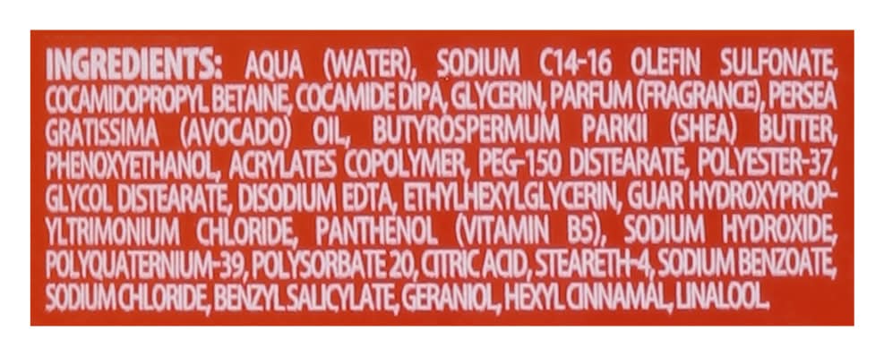 Ingredients: Aqua (Water), Sodium C14-16 Olefin Sulfonate, Cocamidopropyl Betaine, Cocamide Dipa, Glycerin, Parufm (Fragrance), Persea Gratissima (Avocado) Oil, Butyrospermum Parkii (Shea) Butter, Phenoxyethanol, Acrylates Copolymer, PEG-150 Distearate, Polyester-37, Glycol Distearate, Disodium EDTA, Ethylhexylglycerin, Guar Hydroxypropyltrimonium Chloride, Panthenol (Vitamin B5), Sodium Hydroxide, Polyquaternium-39, Polysorbate 20, Citric Acid, Steareth-4, Sodium Benzoate, Sodium Chloride, Benzyl Salicylate, Geraniol, Hexyl Cinnamal, Linalool