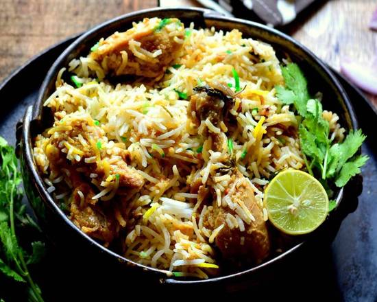 Long grain basmati rice cooked with chicken, aromatic spices and herbs, and garnished with saffron threads. Served with mirchi ka salan and raita.