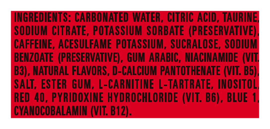 Ingredients: Carbonated Water, Citric Acid, Taurine, Sodium Citrate, Potassium Sorbate (Preservative), Caffeine, Acesulfame Potassium, Sucralose, Sodium Benzoate (Preservative), Gum Arabic, Niacinamide (Vit, B3), Natural Flavors, D-Calcium Pantothenate (Vit. B5), Salt, Ester Gum, L-Carnitine L-Tartrate, Inositol, Red 40, Pyridoxine Hydrochloride (Vit. B6), Blue 1, Cyanocobalamin (Vit. B12) Contains 163mg of caffeine