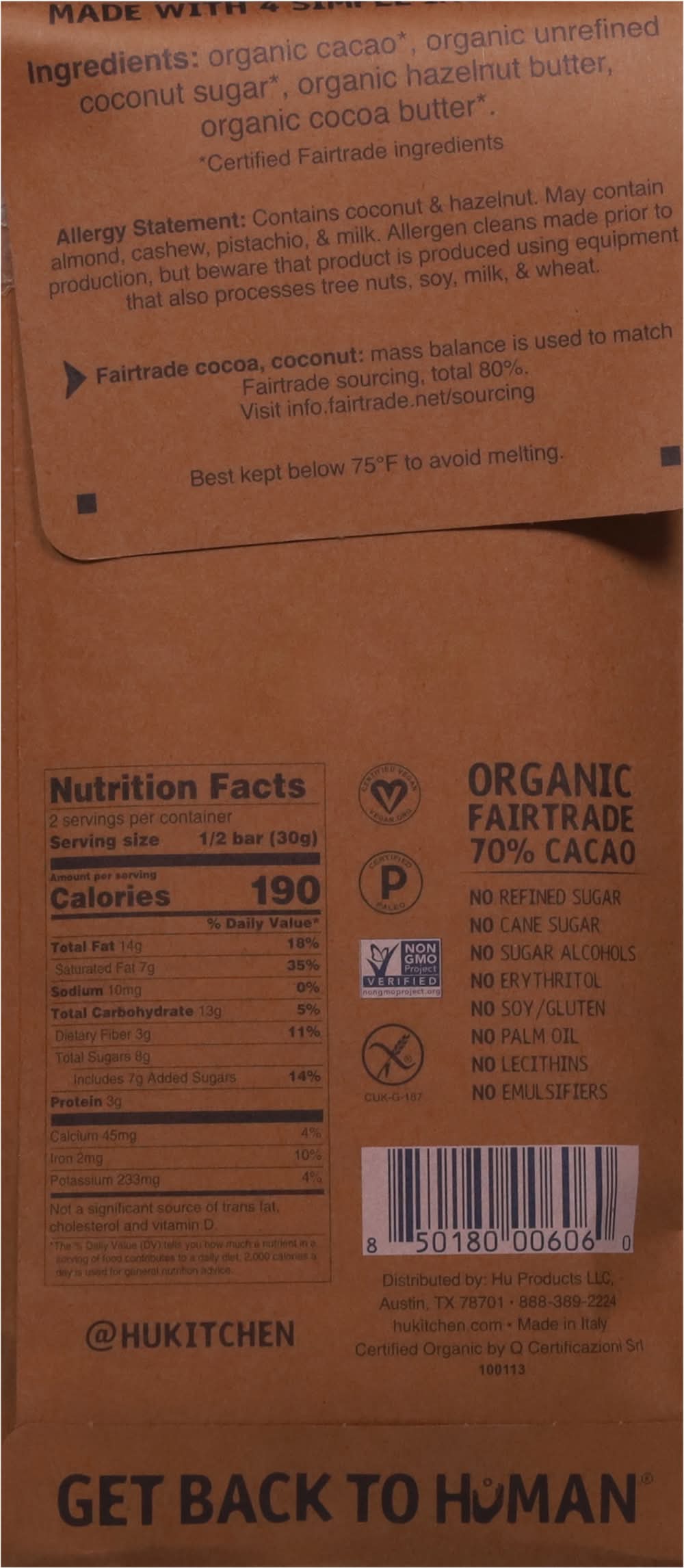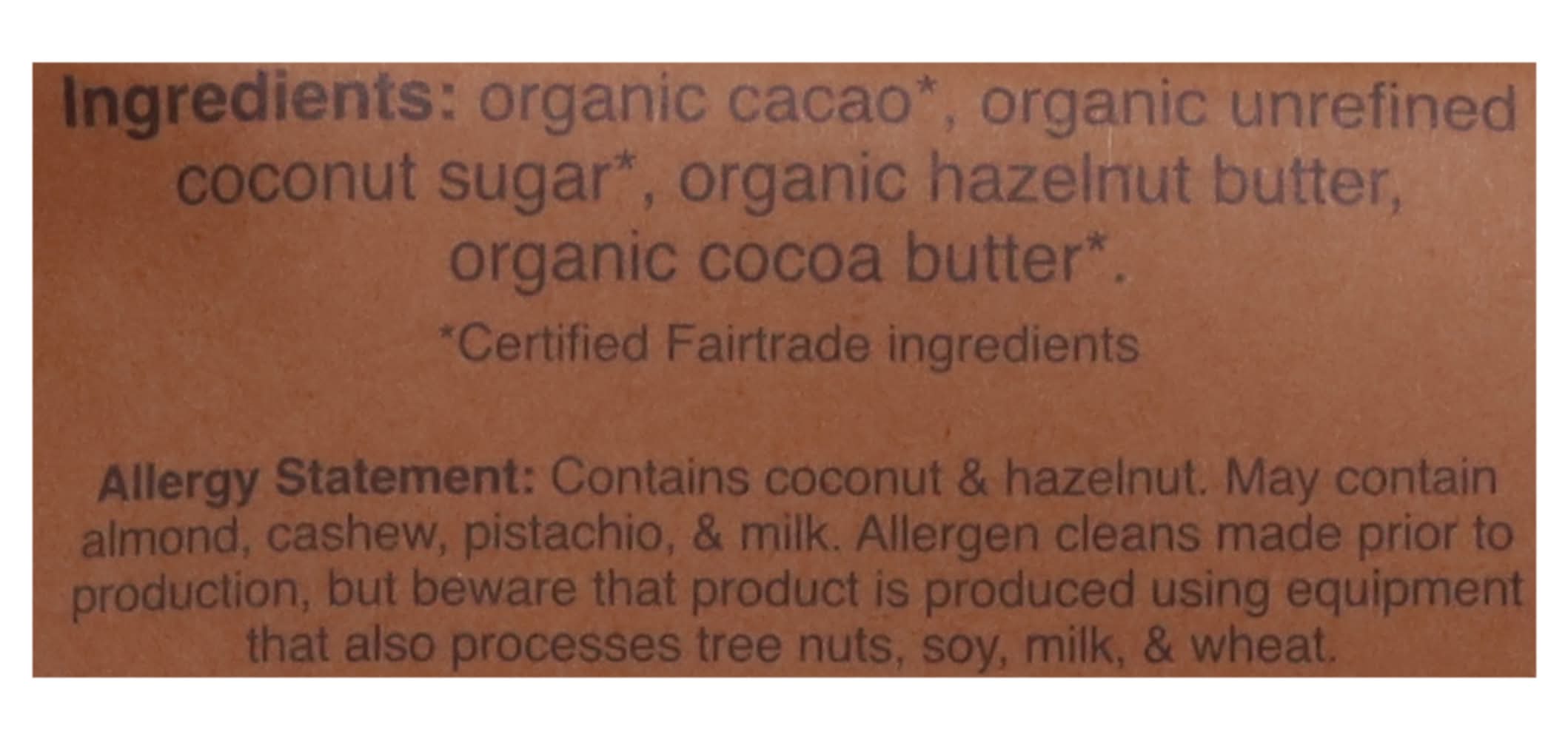Ingredients: Organic Cacao*, Organic Unrefined Coconut Sugar*, Organic Hazelnut Butter, Organic Cocoa Butter*. * Certified Fairtrade Ingredients Contains: Tree Nuts, Soybeans, Wheat