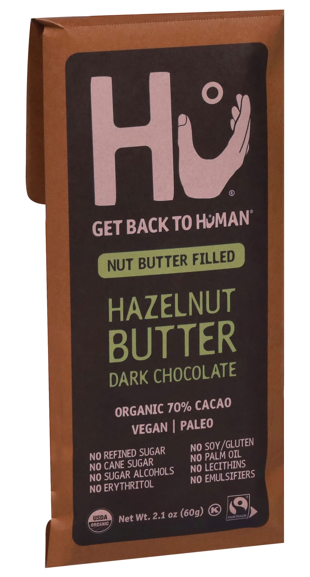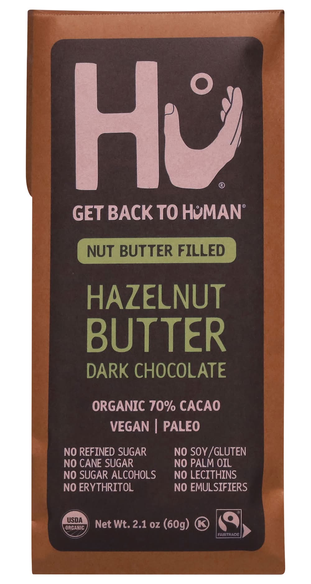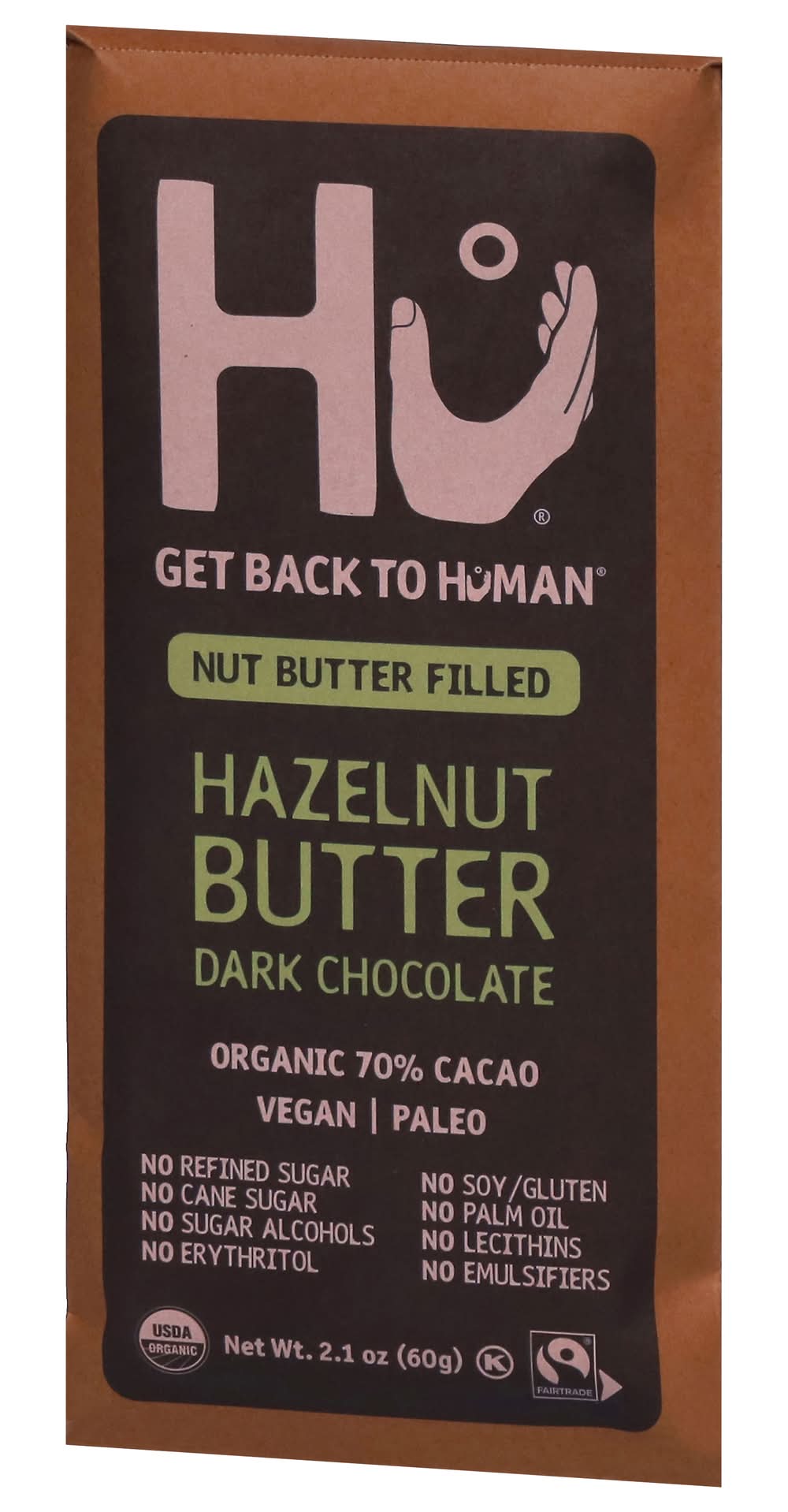 USDA Organic. Certified vegan. Certified Organic by Q Certificazioni Sri. Gluten Free. No refined sugar. No cane sugar. No sugar alcohols. No erythritol. No soy/gluten. No palm oil. No lecithins. No emulsifiers. Non-GMO Project verified. Flavor: Hazelnut