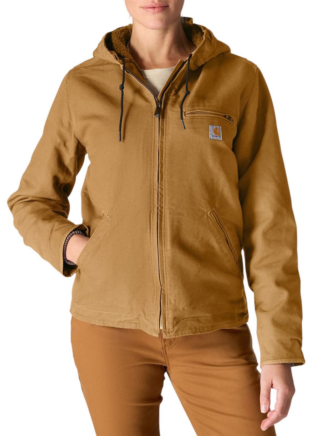 Fit & Design:Sherpa-lined body and quilted nylon sleeve lining for warmth Sherpa-lined hood with hidden drawcord Pleated elbows promote mobility Internal rib-knit storm cuffsPleated bi-swing back provides extra stretch across the shouldersLeft chest pocket with zipper closure2 inside pockets help secure essentials2 Sherpa-lined lower front pockets. Work • Color: Carhartt brown • Size: L • female