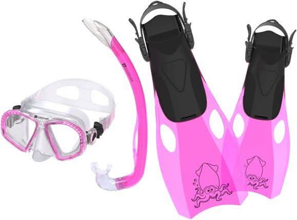 Product Description Comfortable dual tempered lens mask for kids with splash top snorkel. Lightweight fins come in 2 sizes with QD buckle. Carry bag made from recycled water bottles. . Swimming • Color: Pink • Size: S/M