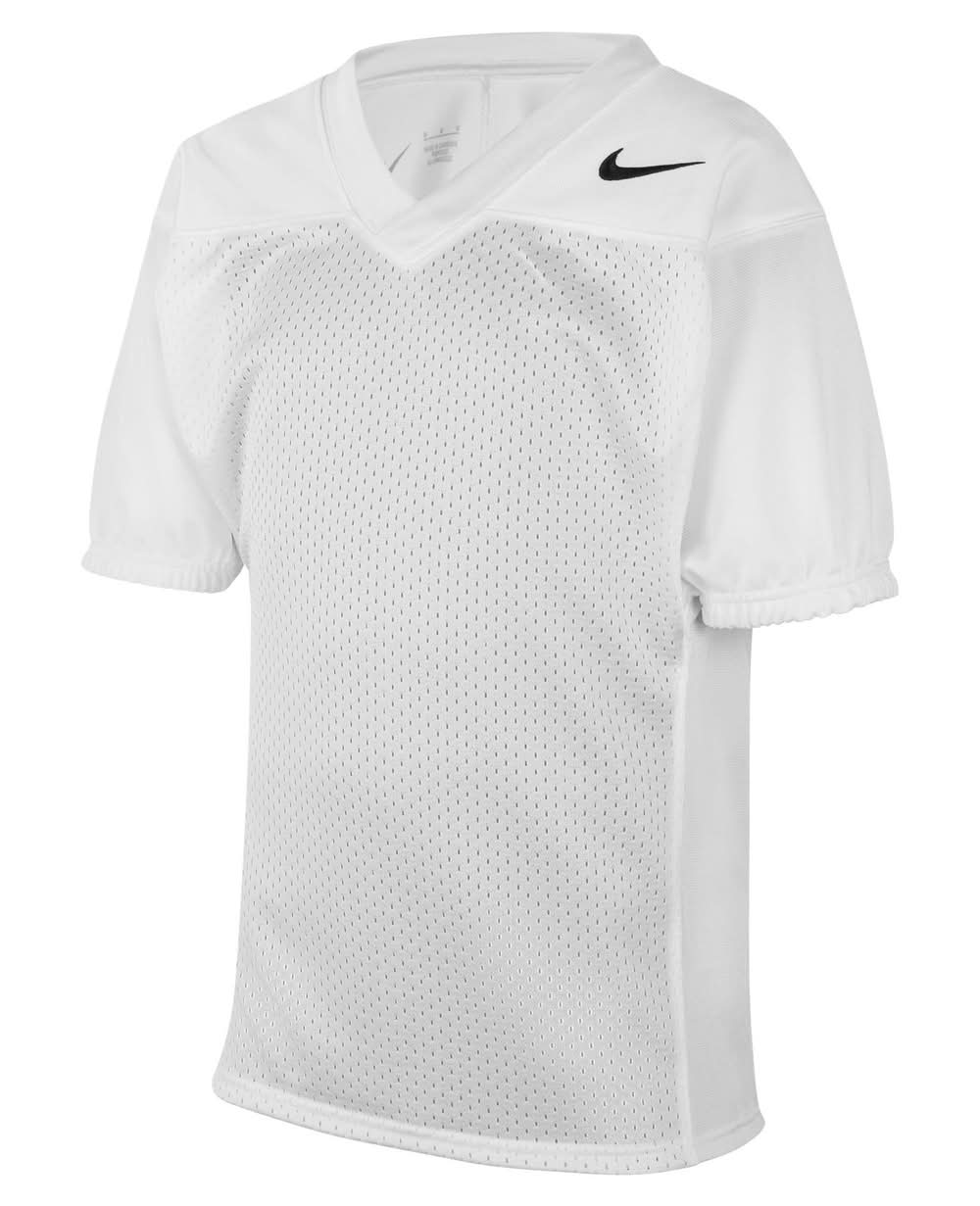 The Nike Football Jersey is everything you need for drills and scrimmages. Made with lightweight mesh and sweat-wicking technology, it helps you stay cool and confident while breaking tackles. Plus, its roomy enough for your shoulder pads and fits slim to avoid distraction. Gear up, its practice time!FEATURESNike Dri-FIT™ technology moves sweat away from your skin for quicker evaporation, helping you stay dry and comfortableMesh is lightweight and breathableElastic at the sleeves helps provide a snug fitDouble-layered shoulder panel provides durabilitySlim design helps keep padding in place while you move. Football. Kids (8-20) • Color: Tm white/tm black • Size: M