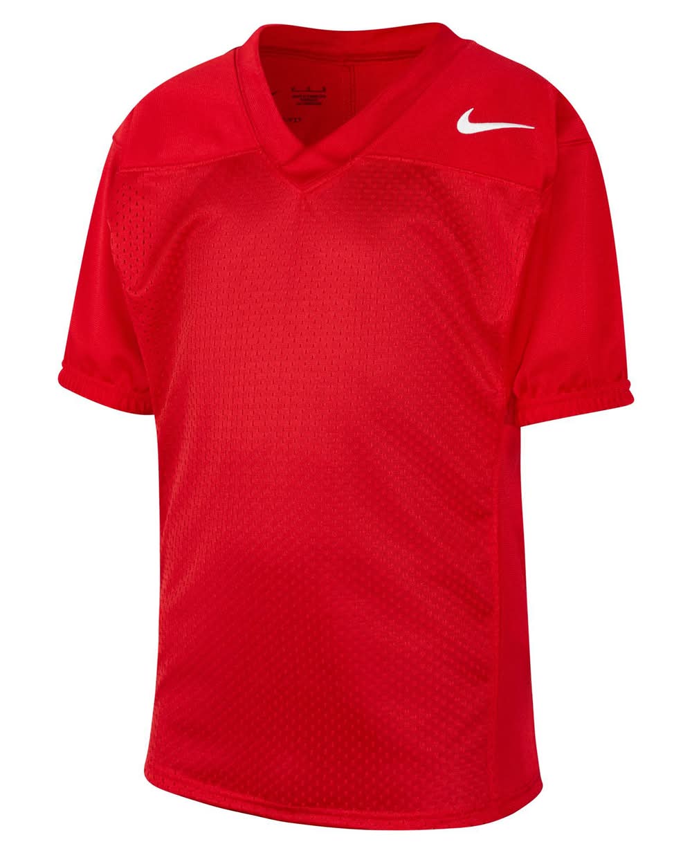 The Nike Football Jersey is everything you need for drills and scrimmages. Made with lightweight mesh and sweat-wicking technology, it helps you stay cool and confident while breaking tackles. Plus, its roomy enough for your shoulder pads and fits slim to avoid distraction. Gear up, its practice time!FEATURESNike Dri-FIT™ technology moves sweat away from your skin for quicker evaporation, helping you stay dry and comfortableMesh is lightweight and breathableElastic at the sleeves helps provide a snug fitDouble-layered shoulder panel provides durabilitySlim design helps keep padding in place while you move. Football. Kids (8-20) • Color: Tm scarlet/tm white • Size: M