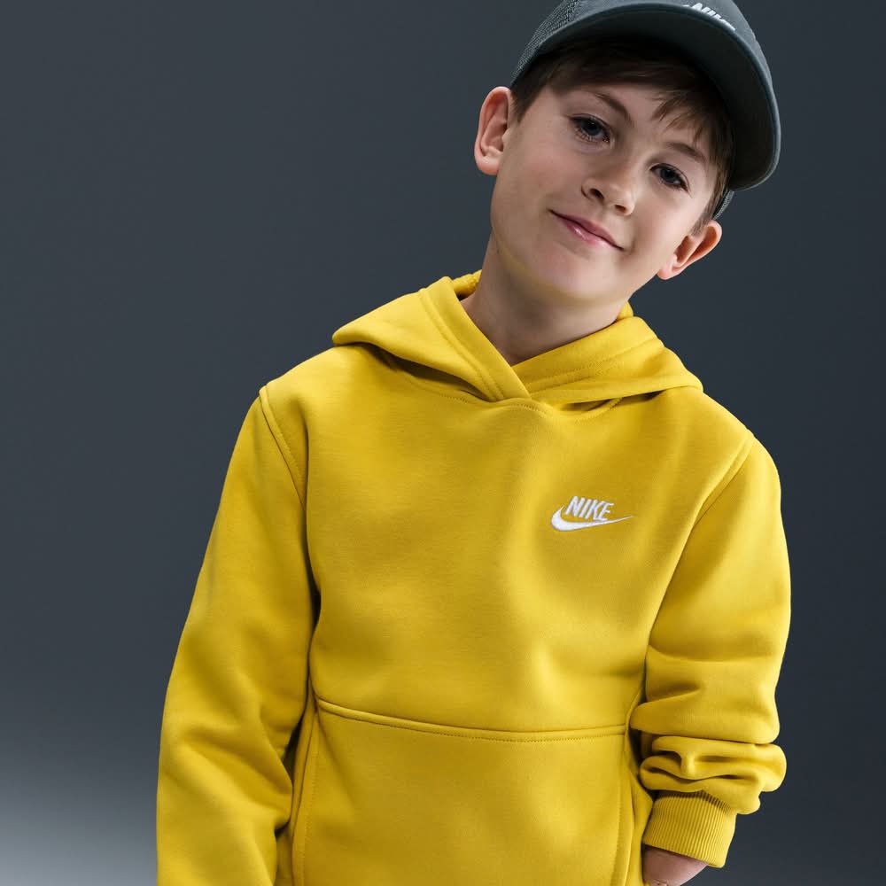 Keep your kids cozy and stylish with the Nike All Kids Fit Sportswear Club Fleece Hoodie. This lightweight pullover features a regular fit, ribbed trim, and a crossover hood design for easy wear. The soft fleece interior and large front pocket make it perfect for keeping warm and storing essentials. Fit & Design: Regular fit lightweight fleece pullover hoodie layers easily when extra warmth is needed Ribbed trim on cuffs and hem helps hold in heat when it gets chilly Crossover hood design makes it easy to instantly pull on and off One large front pocket for them to store their snacks and essentials Smooth on outside, and brushed soft fleece on the inside feels cozy and soft in the cold Embroidered Futura logo shows their love for Nike Designed for every shape and size, this new and improved fit is for all kids Additional Details: Machine washable Imported . Casual. Kids (8-20) • Color: Bright citron/white • Size: L
