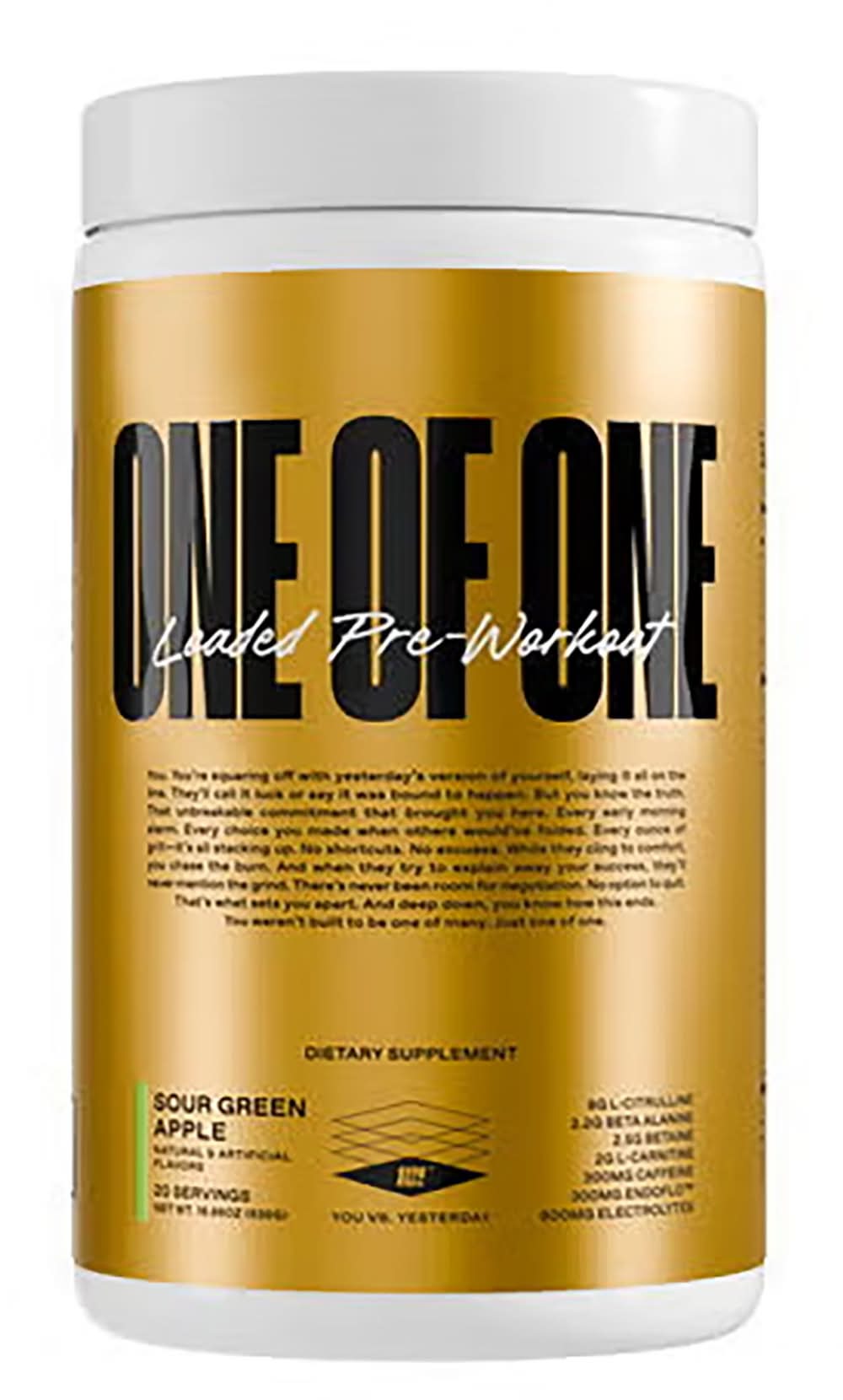 ONE OF ONE Loaded Pre-Workout is charged with everything you need for the ultimate workout. Formulated with 8G of Citrulline and a powerful blend of heavy-hitting ingredients, it primes you for peak performance, endurance, and relentless focus when it matters most Ingredients: 8G L-Citrulline 3.2G Beta Alanine 2.5G Betaine Anhydrous2G L-Carnitine Tartrate and Acetyl L-Carnitine 600mg Electrolytes 300mg EndoFlo™300mg NAC 300mg GENIUS PURE™ ALPHA GPC 150mg NeuroRush™ 125mg Dynamine® How to use: Mix one scoop (26.8 g) in 12 - 16 oz (355 - 473 ml) of water, 30 - 60 minutes before training or physical activity. . Exercise & Fitness