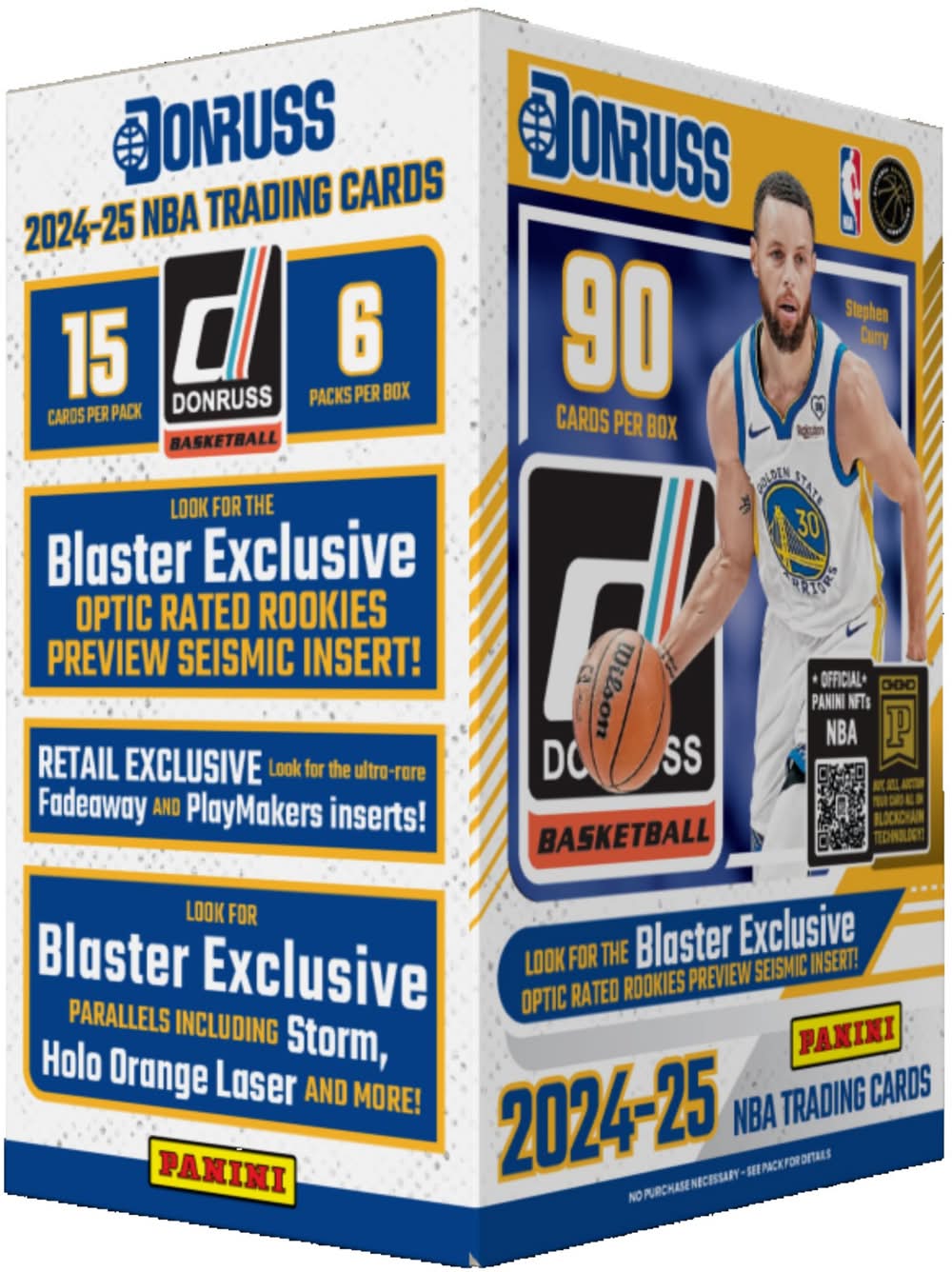 2024-25 Panini Donruss Basketball NBA Blaster Box Each Blaster Box contains: 15 cards per pack, 6 packs per box for a total of 90 trading cards Find up to 12 Inserts/Parallels per Blaster box, on average Blaster Boxes are the only place to find exclusive Parallels in the Base and Rated Rookies set such as Holo Orange Laser (#’d/125), Holo Purple Laser (#’d/99), Holo Red and Blue Laser (#’d/15) and all new this year Storm (#’d/299)! Also search for the new Optic Rated Rookies Preview set in the Blaster-Exclusive Seismic parallel Search for Retail-Exclusive inserts in sets such as Great X-Pectations, Magicians, The Rookies, Franchise Features, Bomb Squad and all new this year, Pass the Rock Hunt for Retail-Exclusive SSP’s Fadeaway and Playmakers Search for randomly inserted Autographs in sets such as Rated Rookies Signatures and Signature Series! Find the Blaster-Exclusive Signature Series Holo Red and Blue Laser (#’d/25) Panini Donruss makes its return for the 2024-25 NBA Season! Collect the iconic Rated Rookies this year, which includes 50 of the top newcomers! Additional Details All sales are final Content and hit ratios are subject to change without notice Officially licensed product . Fan Gear