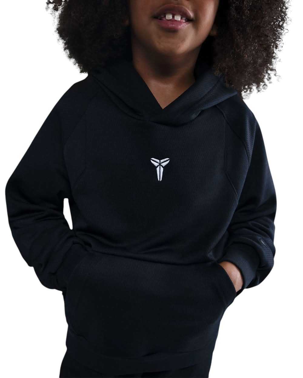 Don't let chilly temps cut your practice short. This super cozy hoodie uses our Therma-FIT technology to help you stay warm—because there's always time for one more shot.Fit and Design:Pullover hoodieStandard fit is easy and traditionalSlightly dropped shoulders and a loose fit provide a comfortable, confident feelRibbed cuffs and hemFront kangaroo pocketSubtle mesh texture on the outside of this pullover hoodie nods to basketball jerseys, giving you the on-court look of your favorite playersSoft brushed insideEmbroidered Kobe logoBranded neck tapeTechnology:Nike Therma-FIT technology helps manage your body’s natural heat to help keep you warm in cold-weather conditionsAdditional Details:Machine wash. Casual. Kids (8-20) • Color: Black/black/white • Size: S