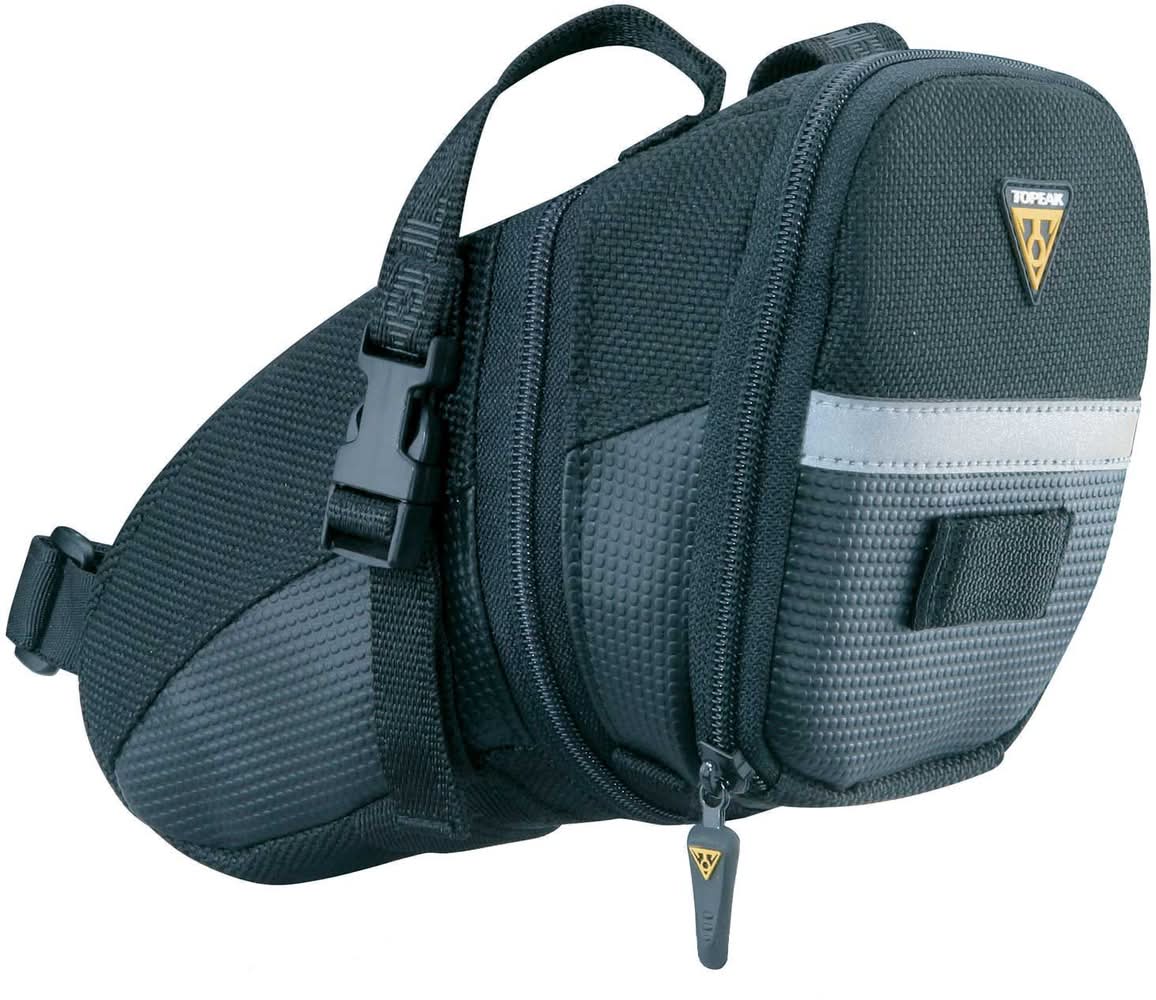 The Topeak Aero Wedge Large Bike Saddle Bag easily stores your riding essentials. It’s expandable, easy to secure, and has a safety clip for attaching a light.FEATURES: Aerodynamic and expandable designQuick Release Buckle system fits all railed saddles3M™ Reflective strip and safety light clipInterior compartment has a mesh pocket for smaller itemsMaterial: 1200 Denier polyesterSPECS:Capacity: 1.48 – 1.97 litersSeat post diameter: Fits 27.2mm – 34.9mm Dimensions: 9.1” x 5.5” x 5.1”Weight: 5.81 oz.. Cycling