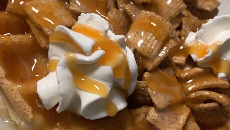 A Huge Belgian Waffle topped with Cinnamon Toast Crunch cereal with Whip cream, White Chocolate & Caramel Drizzled over the top.