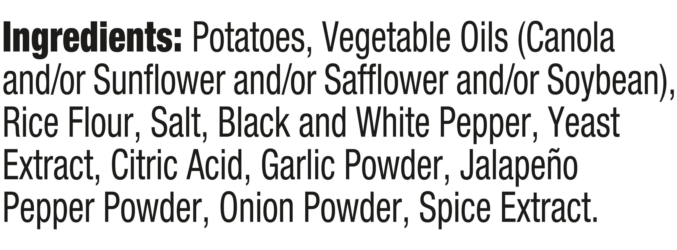 Ingredients: INGREDIENTS: POTATOES, VEGETABLE OILS (CANOLA AND/OR SUNFLOWER AND/OR SAFFLOWER AND/OR SOYBEAN), RICE FLOUR, SALT, BLACK AND WHITE PEPPER, YEAST EXTRACT, CITRIC ACID, GARLIC POWDER, JALAPEÑO PEPPER POWDER, ONION POWDER, SPICE EXTRACT. Contains: 'Gluten Free From'