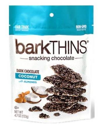 Go tropical with our dark chocolate, toasted coconut and almonds. • Brand: Barkthins • GMO-free