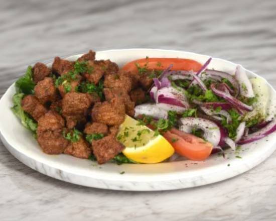 Crispy and flavorful fried soy protein served with fresh lettuce, juicy tomato, and crunchy cucumber, all drizzled with a delectable sauce.