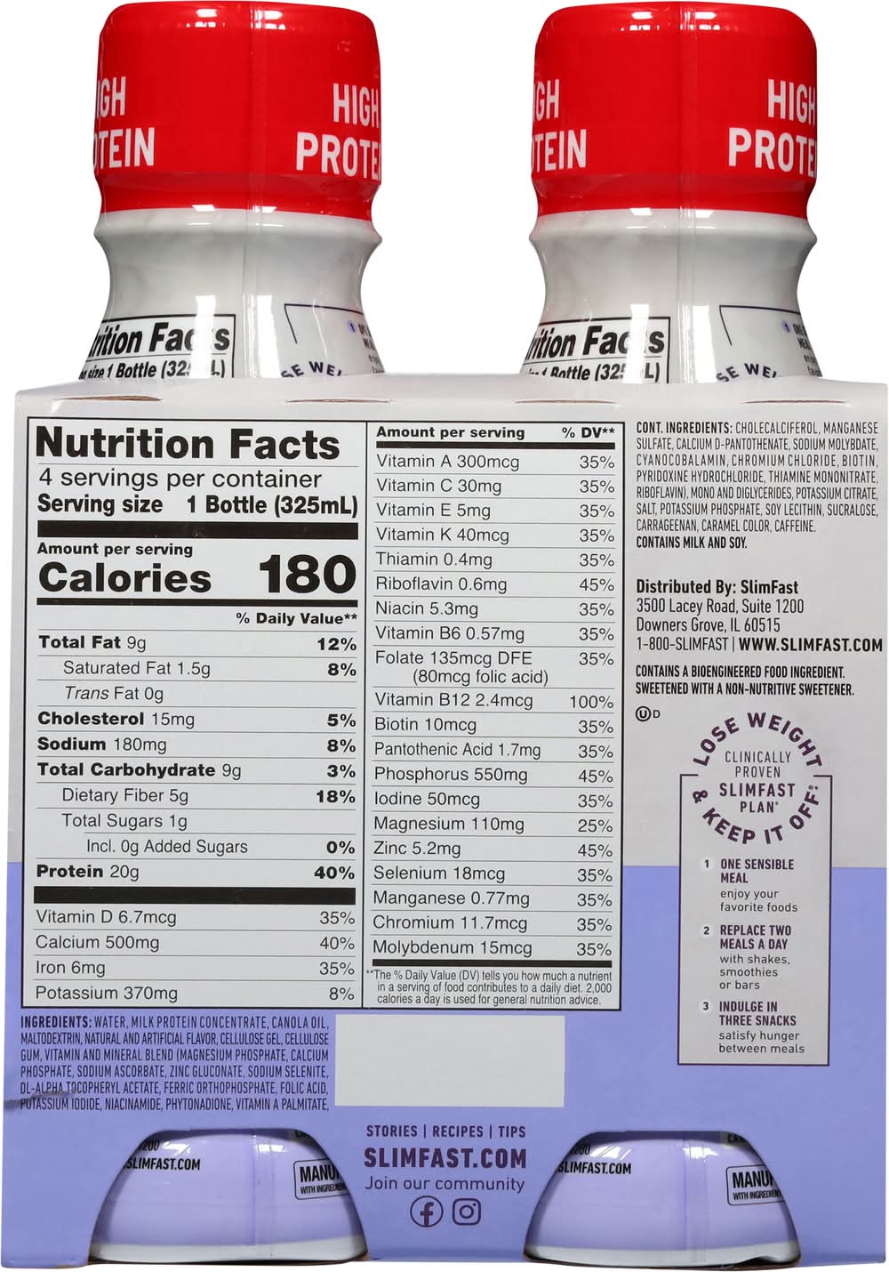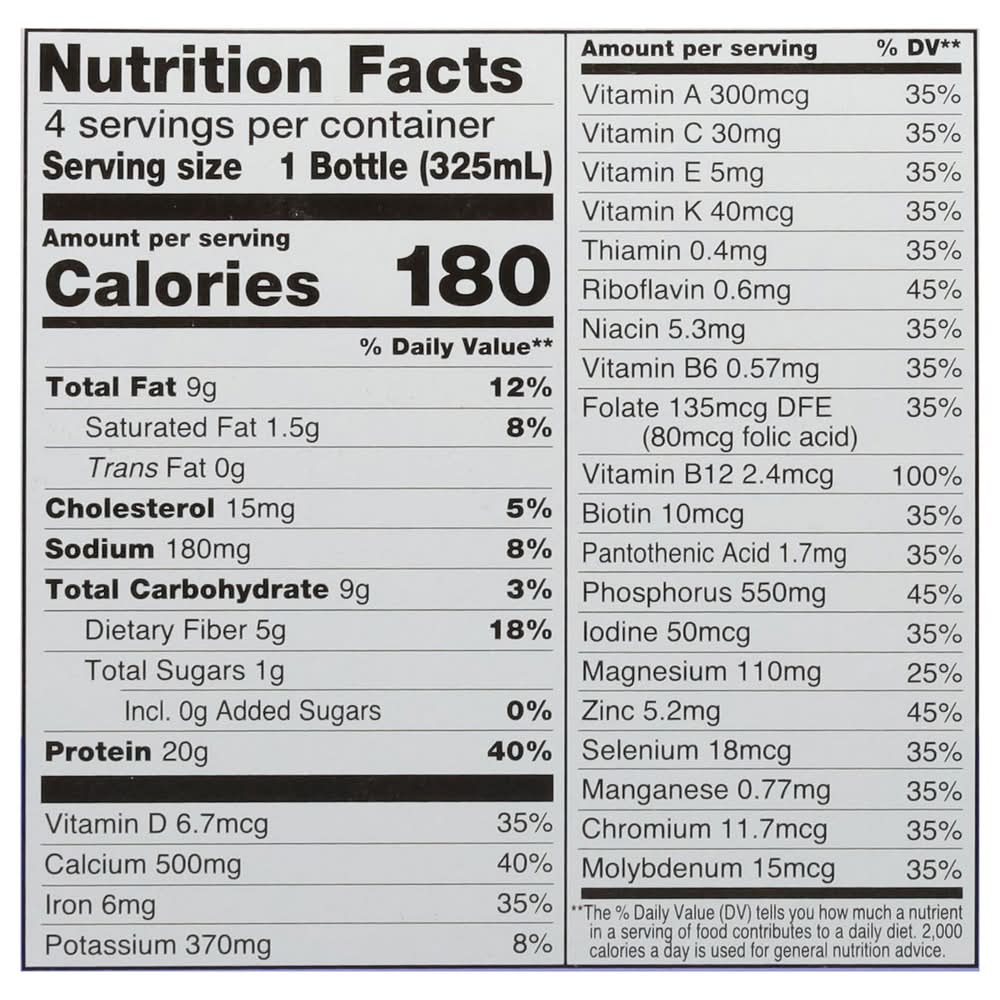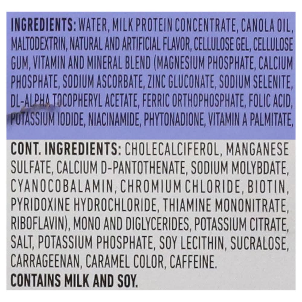 Ingredients: Water, Milk Protein Concentrate, Canola Oil, Maltodextrin, Natural and Artificial Flavor, Cellulose Gel, Cellulose Gum, Vitamin and Mineral Blend (Magnesium Phosphate, Calcium Phosphate, Sodium Ascorbate, Zinc Gluconate, Sodium Selenite, DL-Alpha Tocopheryl Acetate, Ferric Orthophosphate, Folic Acid, Potassium Iodide, Niacinamide, Phytonadione, Vitamin A Palmitate, Cholecalciferol, Manganese Sulfate, Calcium D-Pantothenate, Sodium Molybdate, Cyanocobalamin, Chromium Chloride, Biotin, Pyridoxine Hydrochloride, Thiamine Mononitrate, Riboflavin), Mono and Diglycerides, Potassium Citrate, Salt, Potassium Phosphate, Soy Lecithin, Sucralose, Carrageenan, Caramel Color, Caffeine Contains: Milk, Soybeans