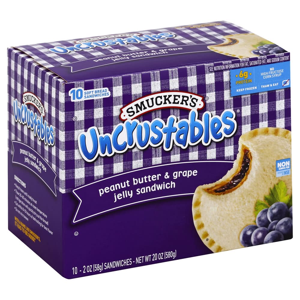 10 soft bread sandwiches. 6 grams protein. Per Sandwich: 210 calories; 2 g sat fat (9% DV); 220 mg sodium (9% DV); 10 g total sugars. See nutrition information for fat, saturated fat and sodium content. No high fructose corn syrup. Soft bread baked fresh. We bake our bread from scratch and freeze our sandwiches on the spot. So when they thaw, you can enjoy soft delicious goodness in every bite. With a name like Smucker's it has to be good! • Flavor: Peanut butter-grape jelly • Pack size: 10 • Size: 10 CT • The J.m. Smucker Company, Orrville,OH,44667 • Packaging: Reusable