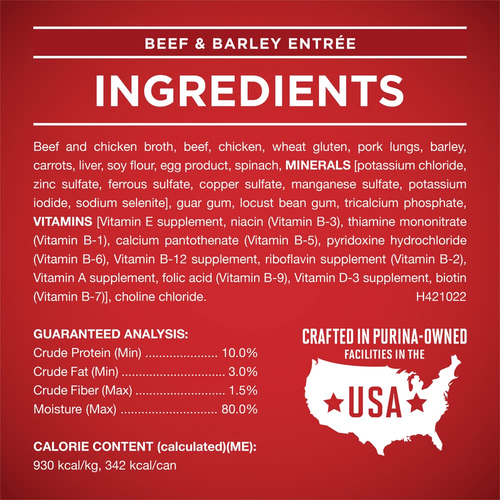 Ingredients: Chicken Brown Rice: Poultry Broth, Chicken, Wheat Gluten, Turkey, Pork Lungs, Liver, Carrots, Brown Rice, Soy Flour, Egg Product, Spinach, MINERALS [Potassium Chloride, Zinc Sulfate, Ferrous Sulfate, Copper Sulfate, Manganese Sulfate, Potassium Iodide, Sodium Selenite], Guar Gum, Locust Bean Gum, Tricalcium Phosphate, VITAMINS [Vitamin E Supplement, Niacin (Vitamin B-3), Thiamine Mononitrate (Vitamin B-1), Calcium Pantothenate (Vitamin B-5), Pyridoxine Hydrochloride (Vitamin B-6), Vitamin B-12 Supplement, Riboflavin Supplement (Vitamin B-2), Vitamin A Supplement, Folic Acid (Vitamin B-9), Vitamin D-3 Supplement, Biotin (Vitamin B-7)], Choline Chloride.\tH421122 Beef Barley: Beef And Chicken Broth, Beef, Chicken, Wheat Gluten, Pork Lungs, Barley, Carrots, Liver, Soy Flour, Egg Product, Spinach, MINERALS [Potassium Chloride, Zinc Sulfate, Ferrous Sulfate, Copper Sulfate, Manganese Sulfate, Potassium Iodide, Sodium Selenite], Guar Gum, Locust Bean Gum, Tricalcium Phosphate, VITAMINS [Vitamin E Supplement, Niacin (Vitamin B-3), Thiamine Mononitrate (Vitamin B-1), Calcium Pantothenate (Vitamin B-5), Pyridoxine Hydrochloride (Vitamin B-6), Vitamin B-12 Supplement, Riboflavin Supplement (Vitamin B-2), Vitamin A Supplement, Folic Acid (Vitamin B-9), Vitamin D-3 Supplement, Biotin (Vitamin B-7)], Choline Chloride.\tH421022 Contains: Wheat, Gluten, Soybeans