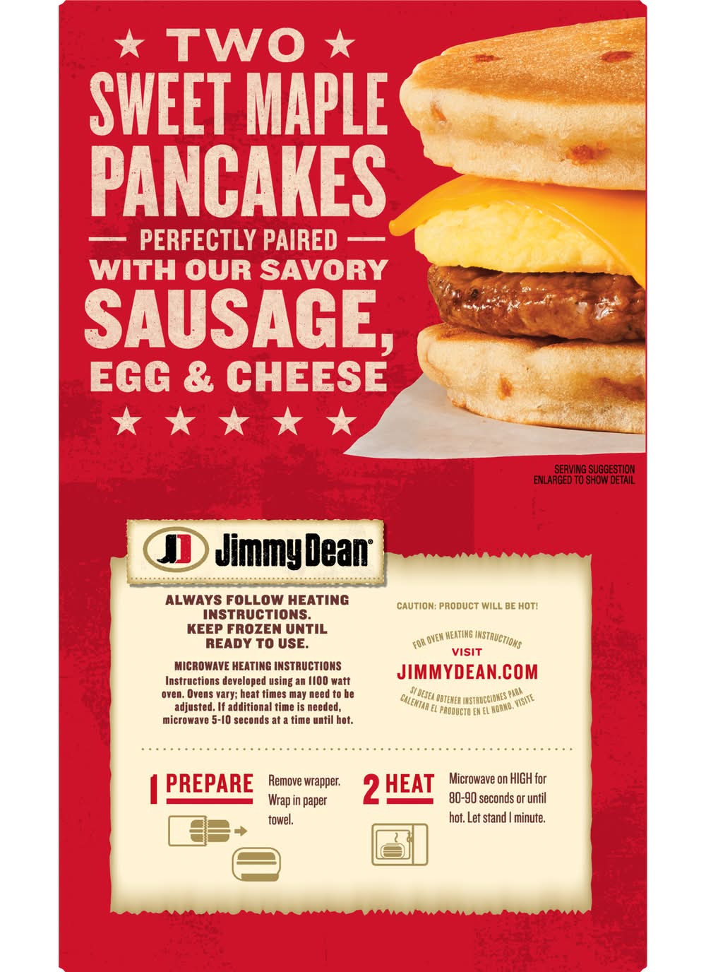 Directions for use: Directions: Always follow heating instructions. Keep frozen until ready to use. Microwave Heating Instructions: Instructions developed using an 1100-watt microwave oven. Ovens vary; heat times may need to be adjusted. If additional time is needed, microwave 5 seconds at a time until hot. 1. Prepare: Remove wrapper. Wrap in paper towel. 2. Heat: Microwave on high for 80-90 seconds or until hot. Let stand 1 minute. For oven heating instructions, visit www.jimmydean.com. Caution: Product will be hot! Keep frozen. Open. Storage recommendation: Keep frozen.