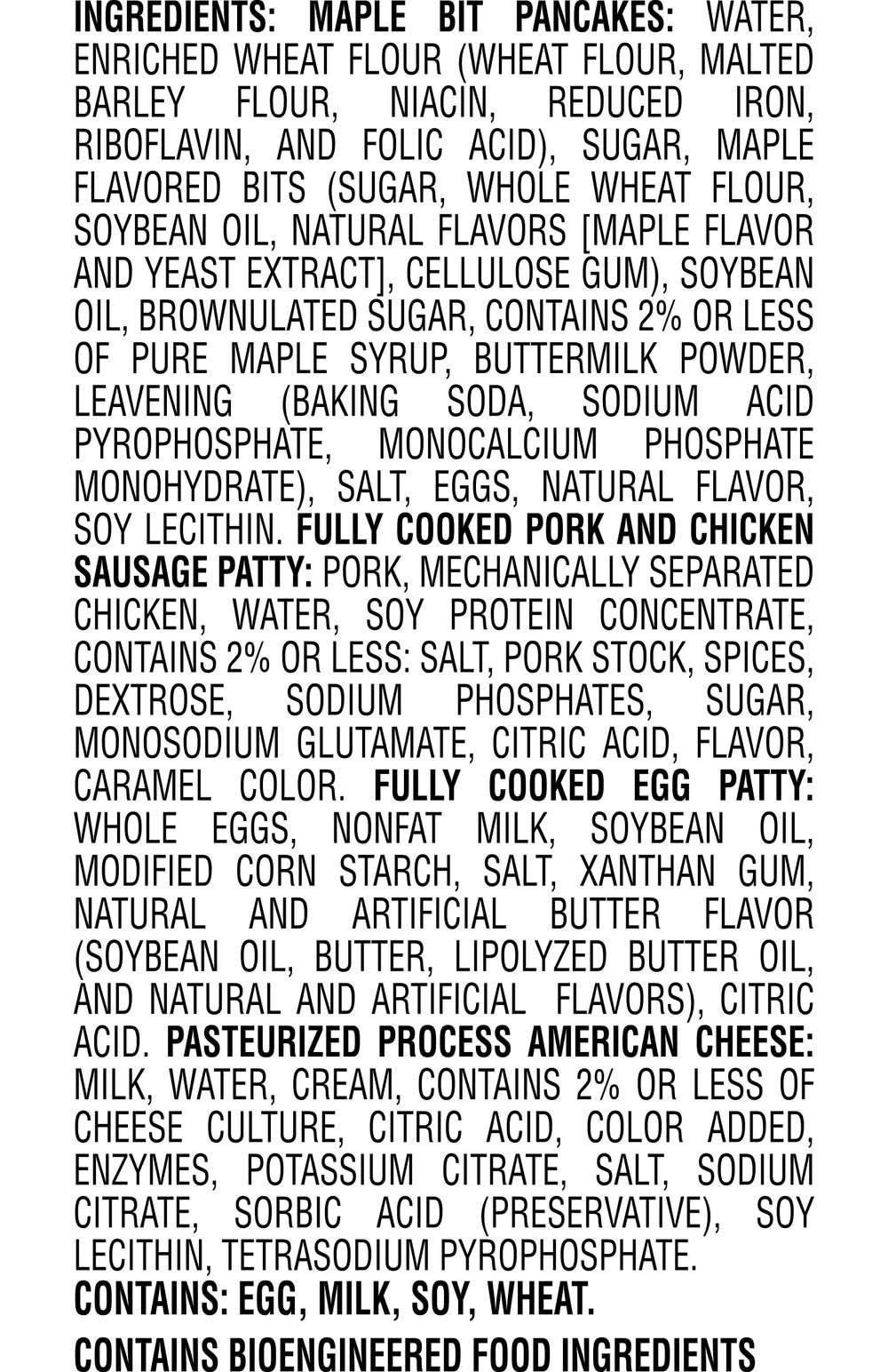 Ingredients: Maple Bit Pancakes: Water, enriched wheat flour (wheat flour, malted barley flour, niacin, reduced iron, riboflavin, and folic acid), sugar, maple flavored bits (sugar, whole wheat flour, soybean oil, natural flavors [maple flavor and yeast extract], cellulose gum), soybean oil, brownulated sugar, contains 2% or less of pure maple syrup, buttermilk powder, leavening (baking soda, sodium acid pyrophosphate, monocalcium phosphate monohydrate), salt, eggs, natural flavor, soy lecithin. Fully Cooked Pork And Chicken Sausage Patty: Pork, mechanically separated chicken, water, soy protein concentrate, contains 2% or less: salt, pork stock, spices, dextrose, sodium phosphates, sugar, monosodium glutamate, citric acid, flavor, caramel color. Fully Cooked Egg Patty: Whole eggs, nonfat milk, soybean oil, modified corn starch, salt, xanthan gum, natural and artificial butter flavor (soybean oil, butter, lipolyzed butter oil, and natural and artificial flavors), citric acid. Pasteurized Process American Cheese: [Milk, water, cream, contains 2% or less of cheese culture, citric acid, color added, enzymes, potassium citrate, salt, sodium citrate, sorbic acid (preservative), soy lecithin, tetrasodium pyrophosphate]. Contains: Eggs, Milk, Soybeans, Wheat, Barley, Corn