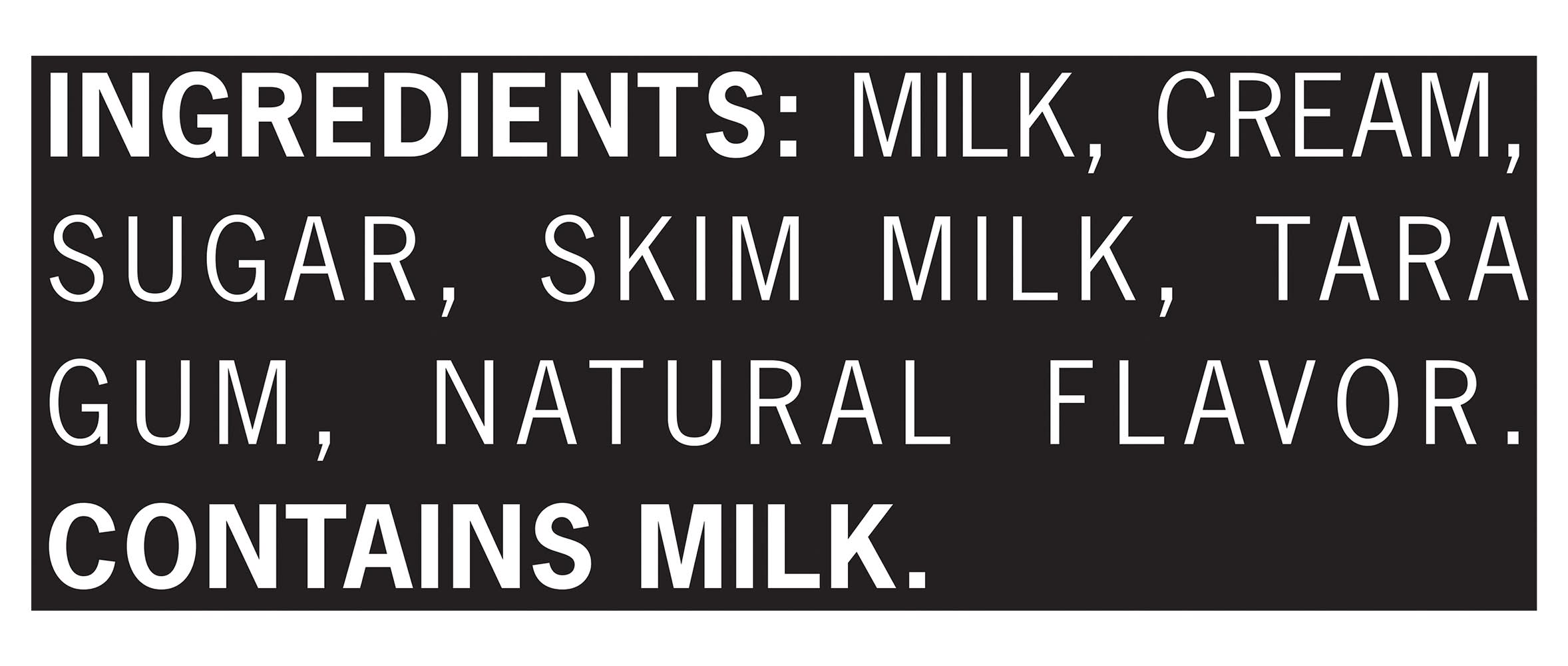 Ingredients: Milk, Cream, Sugar, Skim Milk, Tara Gum, Natural Flavor. Contains: Milk
