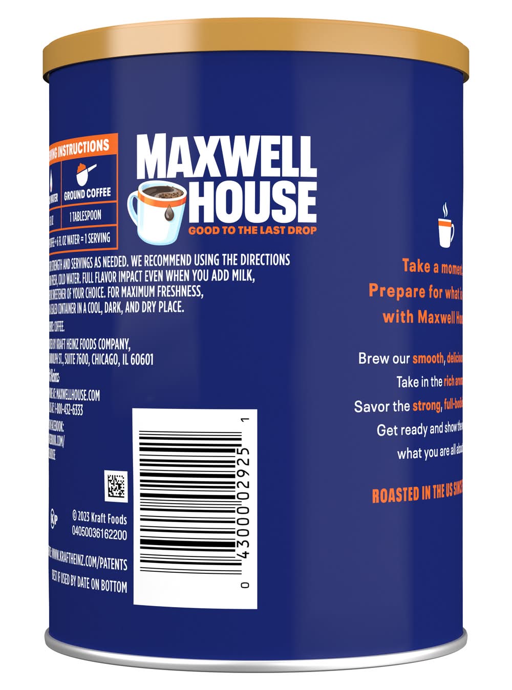 When you're in the mood for a lighter brew, start your day with Maxwell House Light Roast Breakfast Blend Ground Coffee. The perfect balance of strength and flavor, our Breakfast Blend light roast ground coffee is bright, smooth and gentle on the palate. Trusted by generations of coffee drinkers, our light roast coffee has a consistently great taste that’s good to the last drop. Great served black, with Maxwell House International Cafe as creamer, or however you take your coffee, our 100% pure coffee is perfect for brewing in your drip coffee maker. Our Certified Kosher ground coffee is packaged in an 11-ounce resealable canister to lock in flavor and freshness in between uses. From lively light roasts to full bodied dark blends, Maxwell House's signature taste is created through a process that isn't done the easy way, but the right way, for 125 years. • Flavor: Breakfast blend • Size: 11 OZ • Kraft Heinz Foods Company, Chicago, IL, 60601
