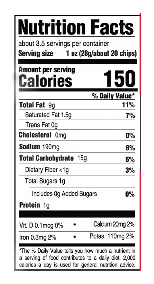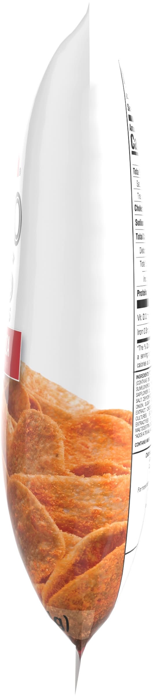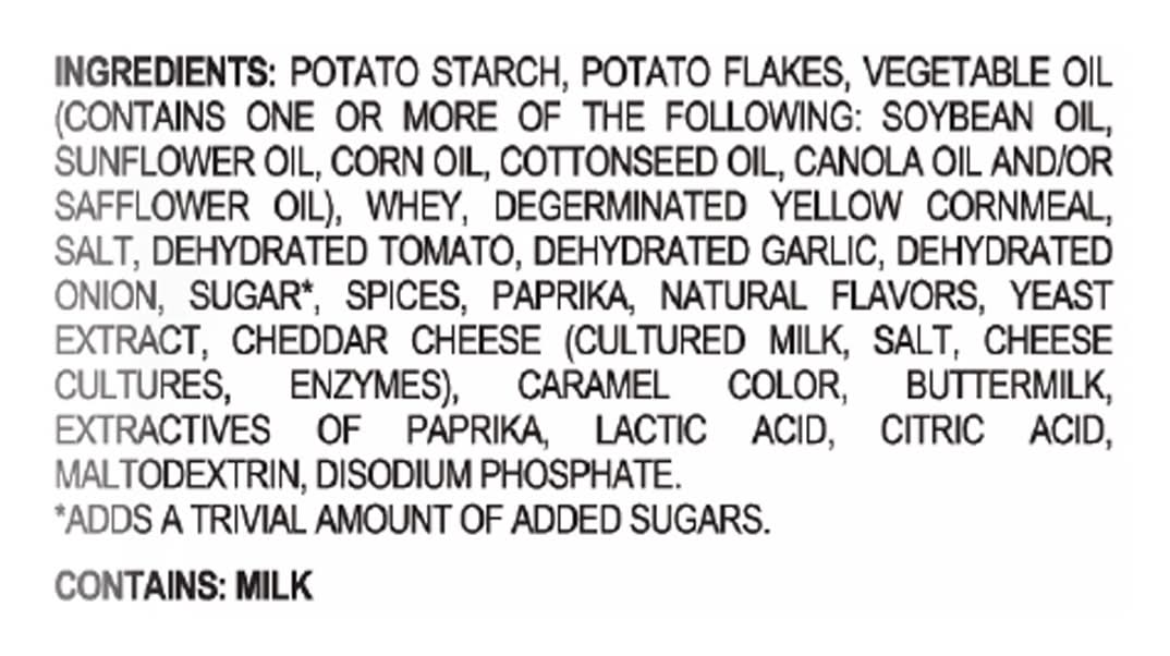 Ingredients: Potato Starch, Potato Flakes, Vegetable Oil (Contains One or More of the Following: Soybean Oil, Sunflower Oil, Corn Oil, Cottonseed Oil, Canola Oil and/or Safflower Oil), Whey, Degerminated Yellow Cornmeal, Salt, Dehydrated Tomato, Dehydrated Garlic, Dehydrated Onion, Sugar (Adds a Trivial Amount of Added Sugars), Spices, Paprika, Natural Flavors, Yeast Extract, Cheddar Cheese (Cultured Milk, Salt, Cheese Cultures, Enzymes), Caramel Color, Buttermilk, Extractives of Paprika, Lactic Acid, Citric Acid, Maltodextrin, Disodium Phosphate Contains: Milk, Corn, Soybeans