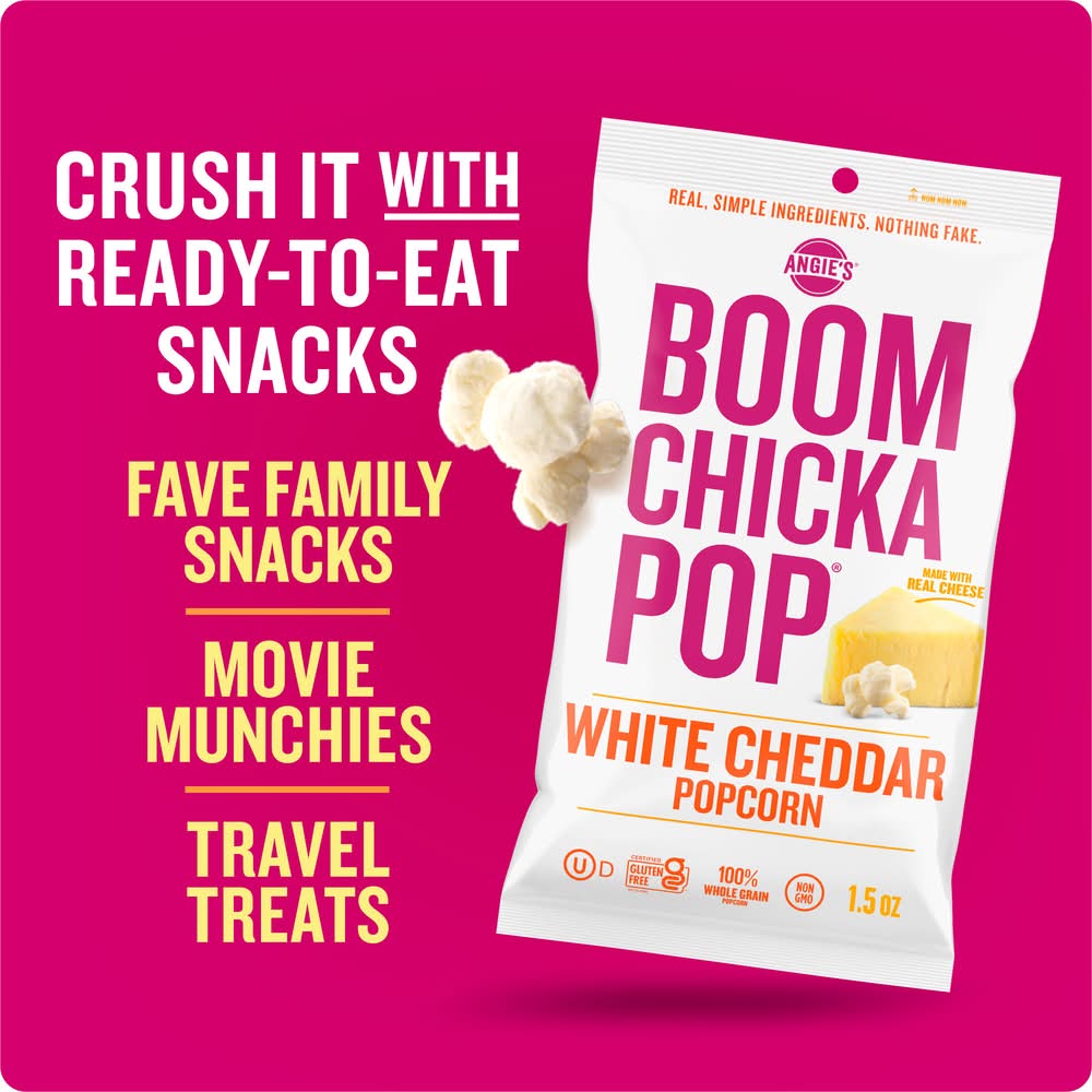 Say cheese! This bag of Angie's BOOMCHICKAPOP White Cheddar Popcorn is a delicious, cheesy snack. Enjoy a gluten-free snacking experience made with non-GMO, whole-grain popped corn and real cheese. This white cheddar cheese popcorn has 60 calories per cup and 0 grams trans fat per serving. It's great for movie nights, road trips, after school, midday munchies or anytime treats. Order a bag of Angie's BOOMCHICKAPOP Popcorn for a pop of positivity anytime. • Size: 1.5 OZ • Angie's Artisan Treats, LLC, 1918 Lookout Drive, N. Mankato, MN, 56003