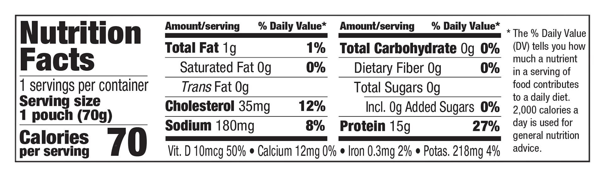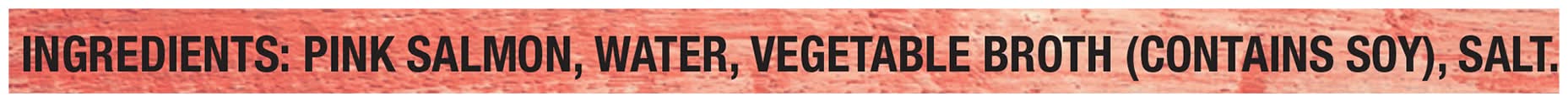 Ingredients: Pink Salmon, Spring Water, Vegetable Broth (Soy), Salt Contains: Fish, Salmon, Soybeans