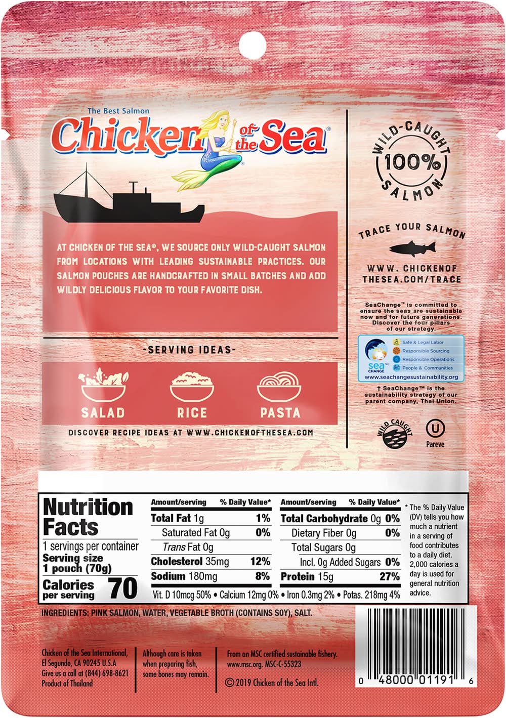 The best salmon. Preservative free. Top your favorite dish. Here, we source only wild-caught salmon from locations with leading sustainable practices. Our salmon pouches are handcrafted in small batches and add wildly delicious flavor to your favorite dish. Wild caught. Seachange is committed to ensure the seas are sustainable now and for future generations. Discover the four pillars of our strategy. • Size: 2.5 OZ • Chicken of the Sea International, El Segundo,CA,90245