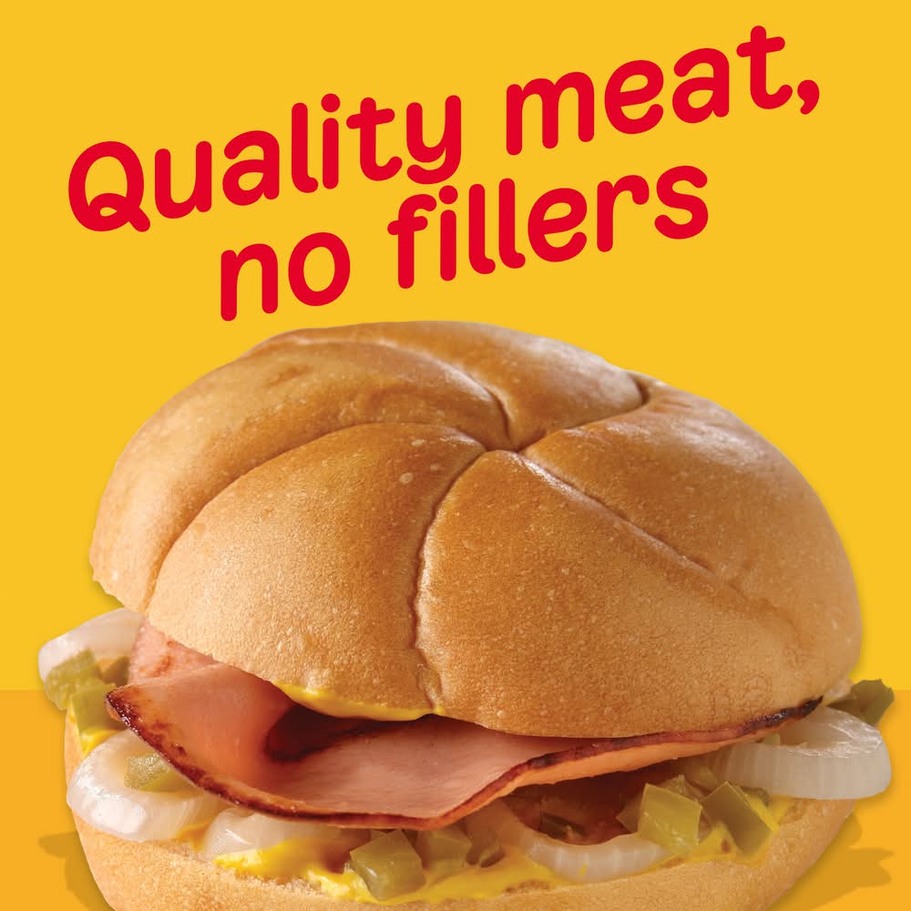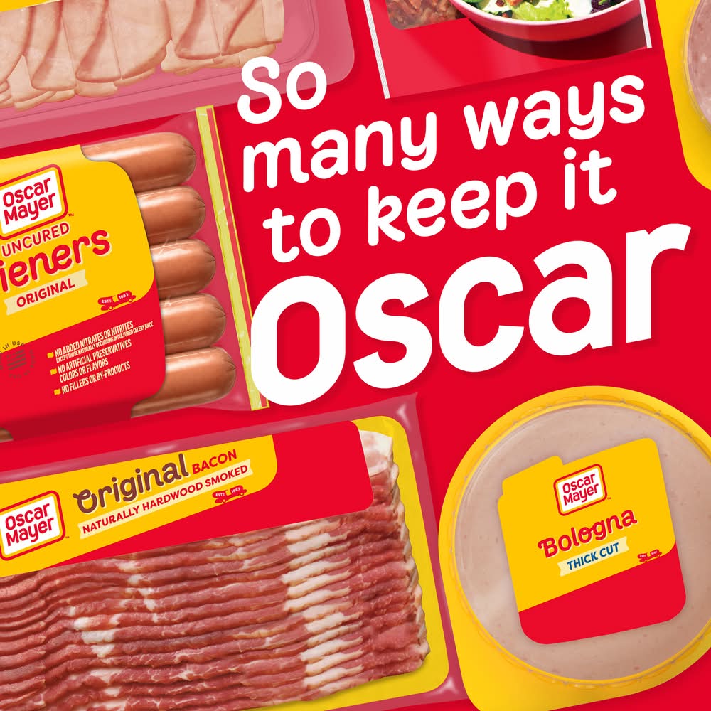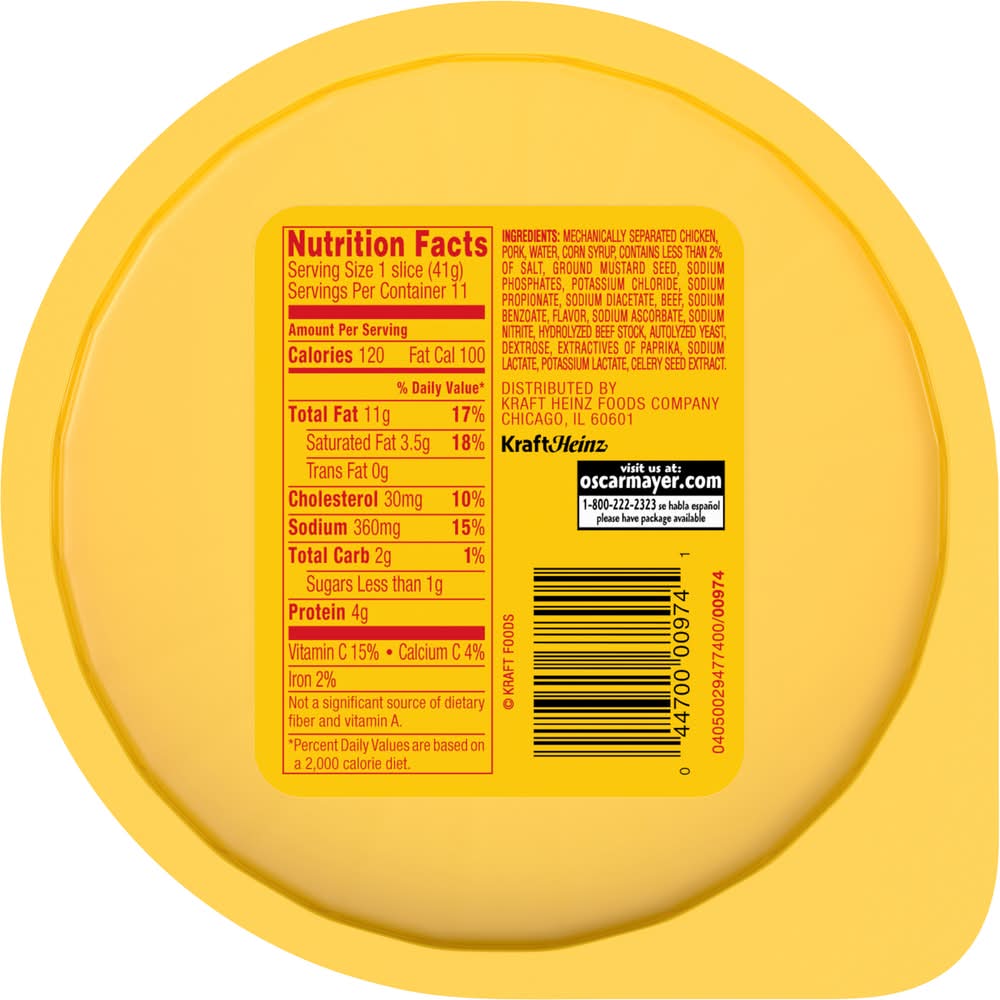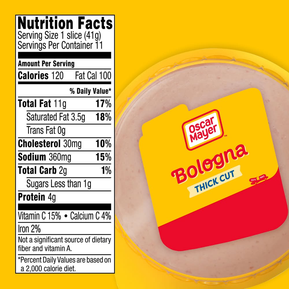 Oscar Mayer has a way with bologna. Our Oscar Mayer Thick Cut Bologna Made with Chicken & Pork, Beef added Lunch Meat is quality sliced meat made without fillers, so you can enjoy the taste you want with nothing you don't. Enjoy thick cut bologna Made with Chicken & Pork, Beef added slices on wheat bread with American cheese for a delicious bologna sandwich, or add it to deli platters for party guests to mix and match their favorite sandwich meats with other flavors. Delicious Oscar Mayer Bologna slices are the ideal sandwich meat for kids and parents alike, and thicker slices means more meat and a more filling sandwich. Fully cooked, our Oscar Mayer Bologna lunch meat is ready to eat and comes in a 16-ounce resealable package to ensure freshness. Keep refrigerated and use within 7 days of opening. If you enjoy our thick cut bologna, be sure to try the other varieties of Oscar Mayer lunch meat. • Size: 16 OZ • Kraft Foods, Chicago,IL,60601