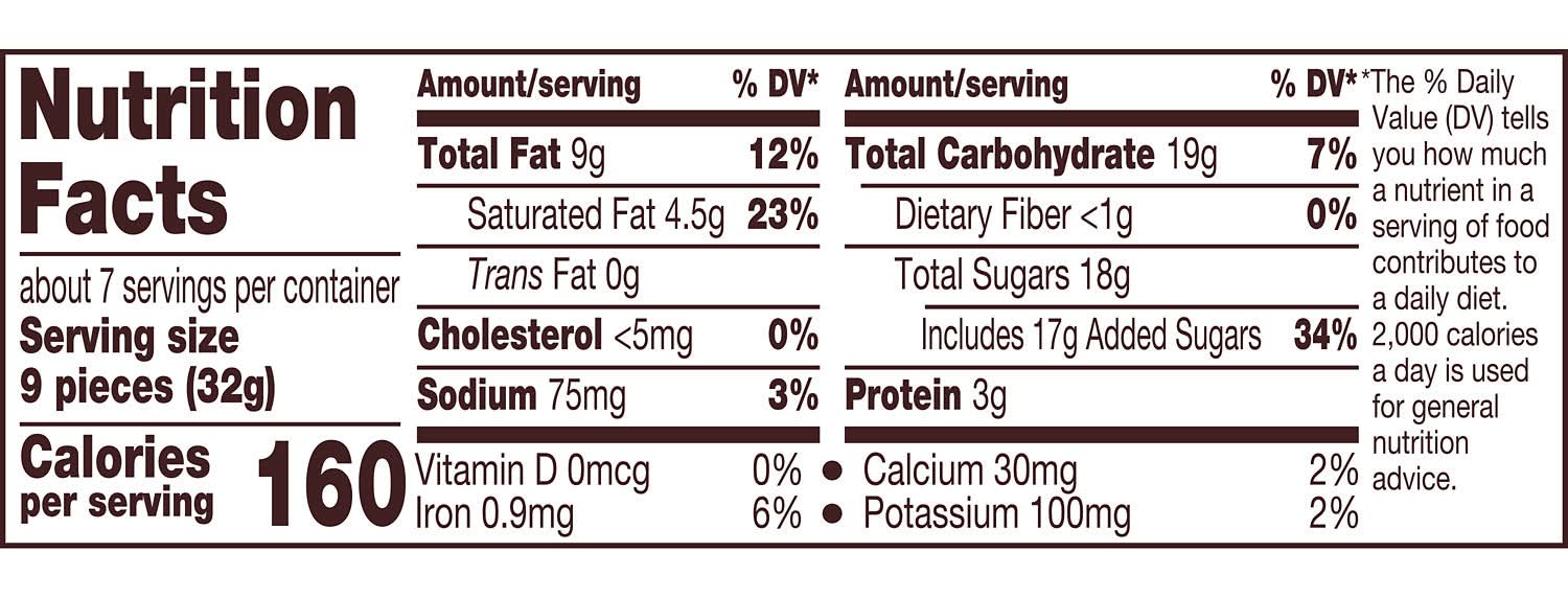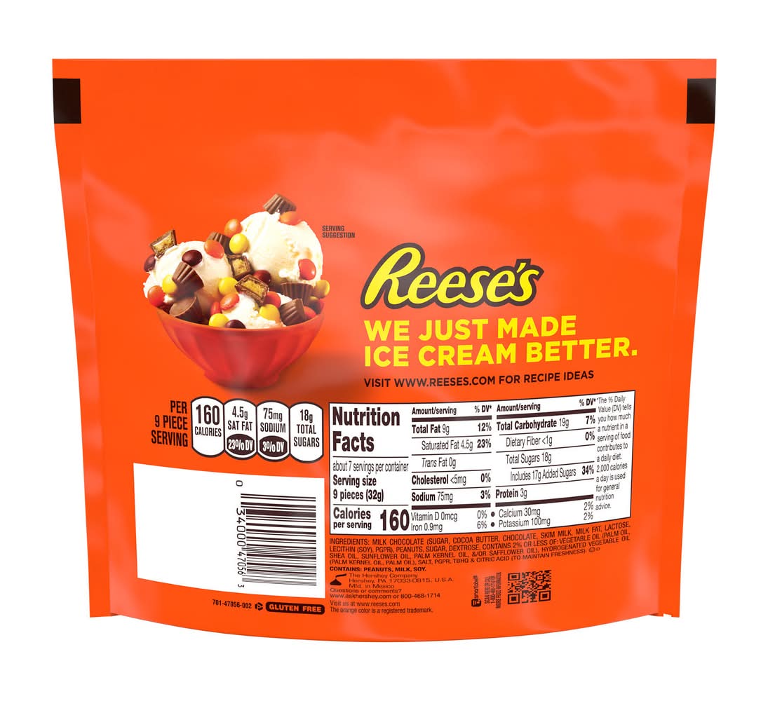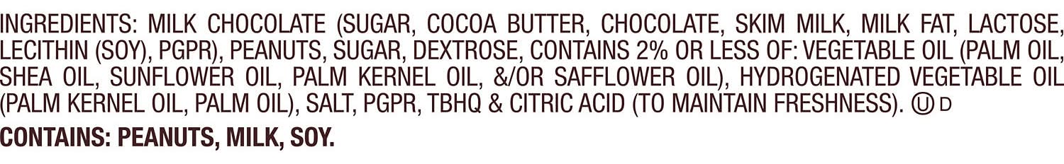 Ingredients: MILK CHOCOLATE (SUGAR, COCOA BUTTER, CHOCOLATE, SKIM MILK, MILK FAT, LACTOSE, LECITHIN (SOY), PGPR), PEANUTS, SUGAR, DEXTROSE, CONTAINS 2% OR LESS OF: VEGETABLE OIL (PALM OIL, SHEA OIL, SUNFLOWER OIL, PALM KERNEL OIL, /OR SAFFLOWER OIL), HYDROGENATED VEGETABLE OIL (PALM KERNEL OIL, PALM OIL), SALT, PGPR, TBHQ CITRIC ACID (TO MAINTAIN FRESHNESS). Contains: Contains: Peanuts, Soy, Milk