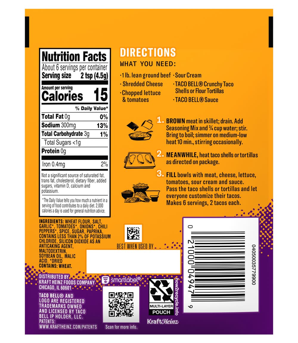 Live más at home with our Taco Bell Mild Taco Seasoning Mix. Taco Bell makes mealtime more craveable with Mexican-style flavors that elevate beef, chicken and pork. Ideal for the whole family, our seasoning mix is great for adding a mild kick of Tex-Mex flavor to meat for tacos, burritos and other dishes. After browning your meat, add our packet of seasoning mix and water, and let it simmer. Each 1-ounce packet seasons about 6 servings. Live more fervently, more authentically, more joyfully with Taco Bell. • Size: 1 OZ • Kraft Heinz Foods Company, Chicago,IL,60601