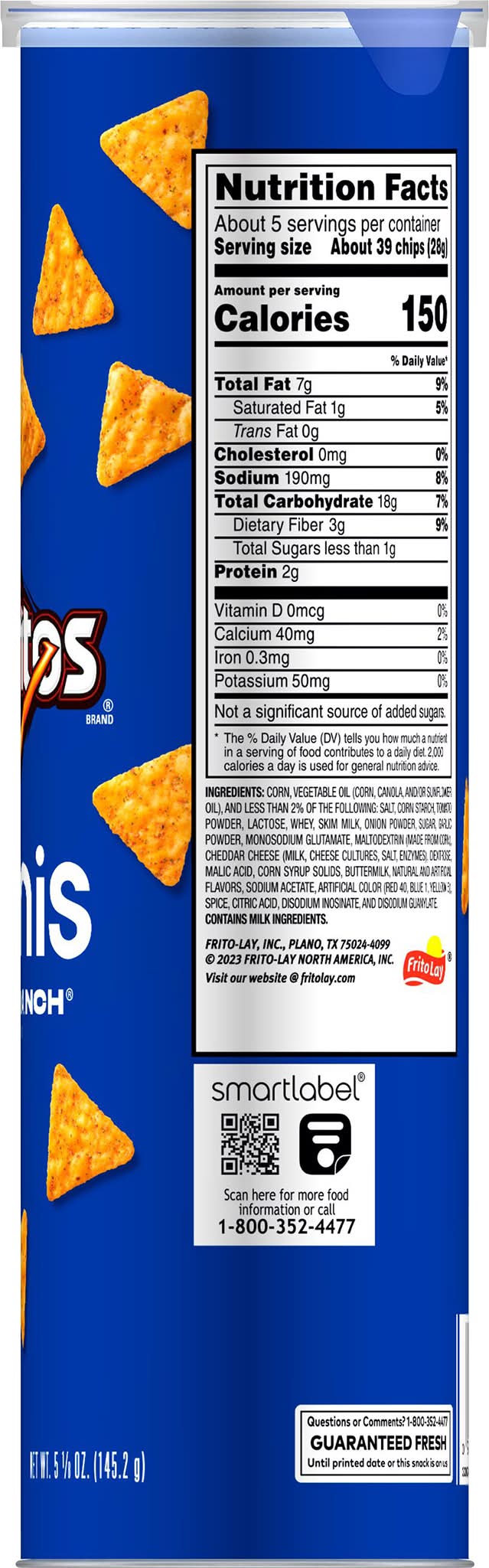 Ingredients: Corn, Vegetable Oil (Corn Canola and/or Sunflower Oil), and Less than 2% of the Following: Salt, Corn Starch, Tomato Powder, Lactose, Whey, Skim Milk, Onion Powder, Sugar, Garlic Powder, Monosodium Glutamate, Maltodextrin (Made from Corn) Cheddar Cheese (Milk Cheese Cultures Salt Enzymes), Dextrose, Malic Acid, Corn Syrup Solids, Buttermilk, Natural and Artificial Flavors, Sodium Acetate, Artificial Color (Red 40 Blue 1 Yellow 5), Spice, Citric Acid, Disodium Inosinate, and Disodium Guanylate Contains: Milk, Corn, Lactose