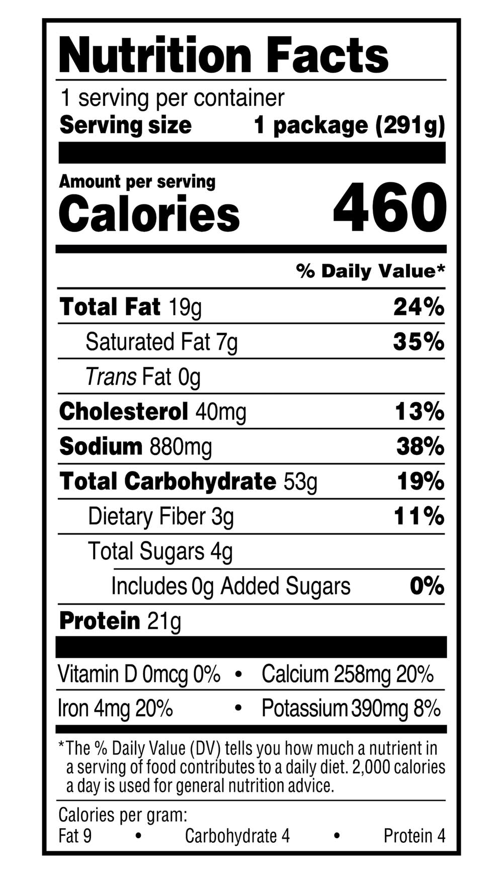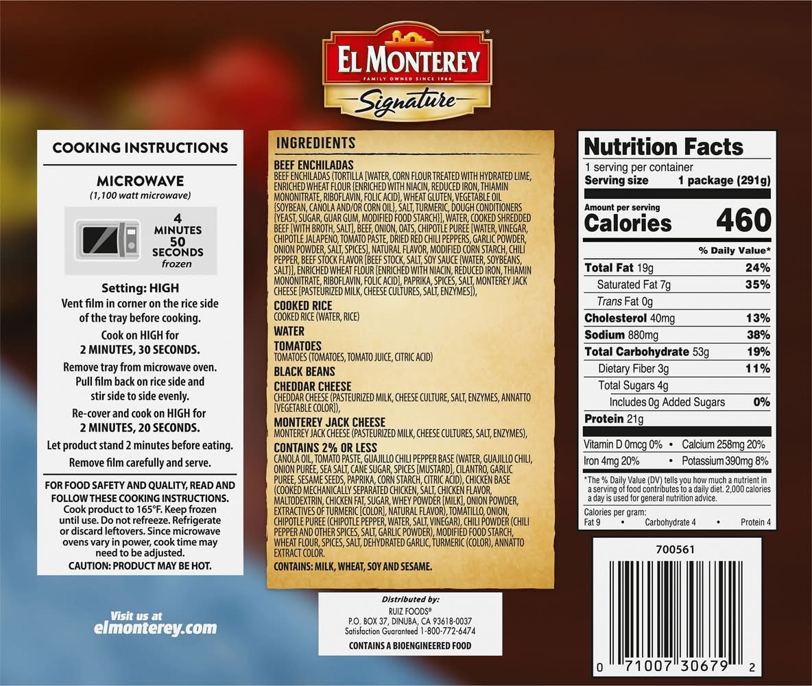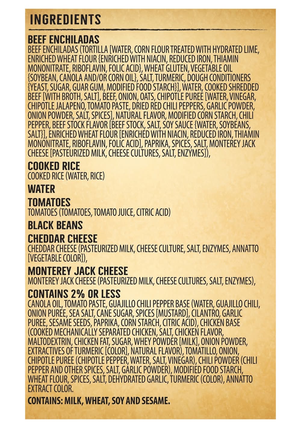Ingredients: Beef Enchilada Tortilla [Water, Corn Flour Treated with Hydrated Lime, Enriched Wheat Flour {Enriched with Niacin, Reduced Iron, Thiamin Mononitrate, Riboflavin, Folic Acid}, Wheat Gluten, Vegetable Oil {Soybean, Canola and/or Corn Oil}, Turmeric, Dough Conditioners {Yeast, Sugar, Guar Gum, Modified Food Starch}], Cooked Shredded Beef [with Broth, Salt], Beef, Onion, Oats, Chipotle Puree [Water, Vinegar, Chipotle Jalapeno, Tomato Paste, Dried Red Chili Peppers, Garlic Powder, Onion Powder, Spices], Natural Flavor, Modified Corn Starch, Chili Pepper, Beef Stock Flavor [Beef Stock, Soy Sauce {Water, Soybeans, Salt}], Enriched Wheat Flour [Enriched with Niacin, Reduced Iron, Thiamin Mononitrate, Riboflavin, Folic Acid], Paprika, Spices, Monterey Jack Cheese [Pasteurized Milk, Cheese Cultures, Enzymes], Cooked Rice: Cooked Rice Water, Rice, Tomatoes: Tomatoes Tomatoes, Tomato Juice, Citric Acid, Cheddar Cheese: Cheddar Cheese Pasteurized Milk, Cheese Culture, Enzymes, Annatto [Vegetable Color], Monterey Jack Cheese: Monterey Jack Cheese Pasteurized Milk, Cheese Cultures, Enzymes, Contains 2% or Less: Canola Oil, Tomato Paste, Guajillo Chili Pepper Base Water, Guajillo Chili, Onion Puree, Sea Salt, Cane Sugar, Spices [Mustard], Cilantro, Garlic Puree, Sesame Seeds, Paprika, Corn Starch, Citric Acid, Chicken Base Cooked Mechanically Separated Chicken, Chicken Flavor, Maltodextrin, Chicken Fat, Sugar, Whey Powder [Milk], Onion Powder, Extractives of Turmeric [Color], Natural Flavor, Tomatillo, Onion, Chipotle Puree Chipotle Pepper, Vinegar, Chili Powder Chili Pepper and Other Spices, Garlic Powder, Modified Food Starch, Wheat Flour, Spices, Dehydrated Garlic, Turmeric Color, Annatto Extract Color, Water Contains: Milk, Wheat, Soybeans, Sesame, Corn, Mustard, Oat, Gluten