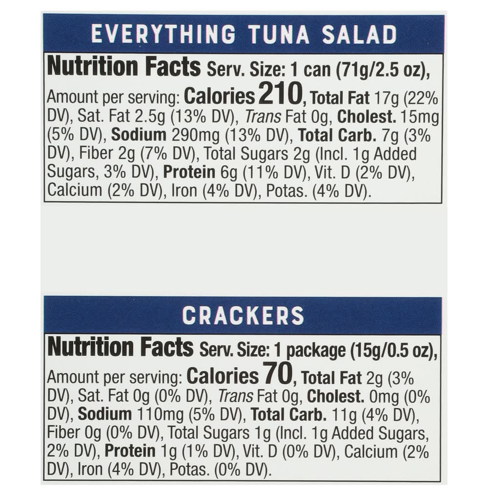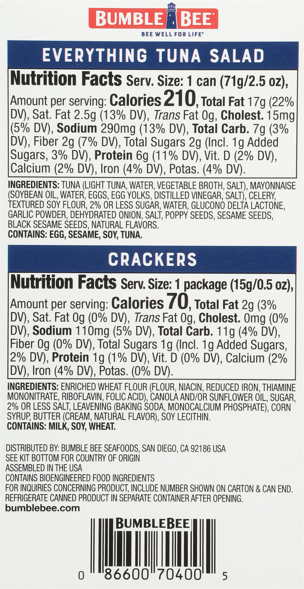 Ingredients: Everything Tuna Salad: Tuna (Light Tuna, Water, Vegetable Broth, Salt), Mayonnaise (Soybean Oil, Water, Eggs, Egg Yolks, Distilled Vinegar, Salt), Celery, Textured Soy Flour, 2% or Less Sugar, Water, Glucono Delta Lactone, Garlic Powder, Dehydrated Onion, Salt, Poppy Seeds, Sesame Seeds, Black Sesame Seeds, Natural Flavors. Crackers: Enriched Wheat Flour (Flour, Niacin, Reduced Iron, Thiamine Mononitrate, Riboflavin, Folic Acid), Canola and/or Sunflower Oil, Sugar, 2% or Less Salt, Leavening (Baking Soda, Monocalcium Phosphate), Corn Syrup, Butter (Cream, Natural Flavor), Soy Lecithin. Contains: Eggs, Sesame, Soybeans, Fish, Tuna, Celery, Milk, Wheat, Corn