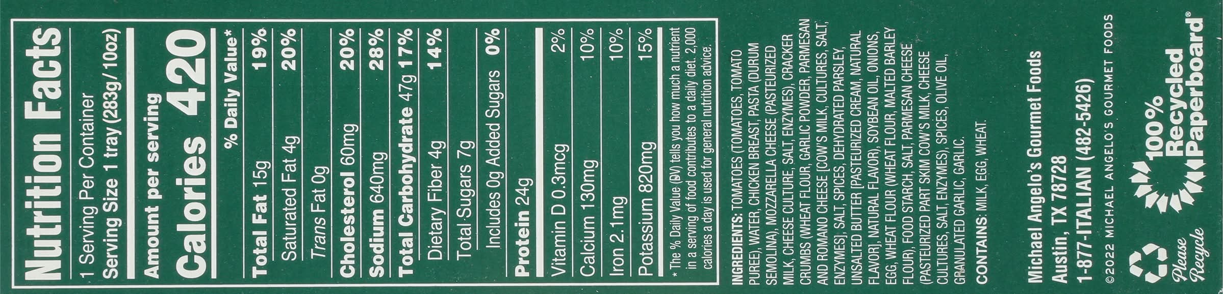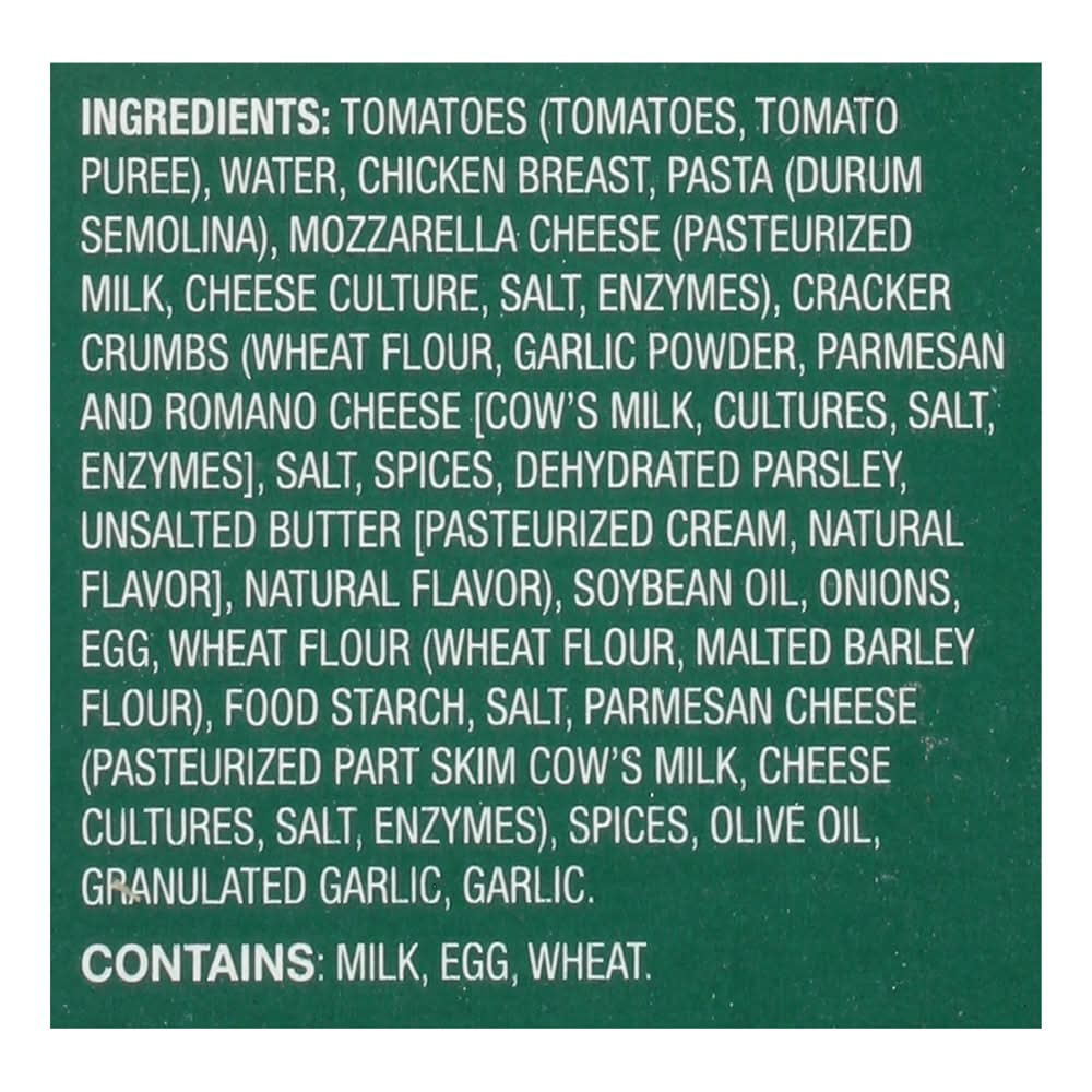 Ingredients: Tomatoes (Tomatoes, Tomato Puree), Water, Chicken Breast, Pasta (Durum Semolina), Mozzarella Cheese (Pasteurized Milk, Cheese Culture, Salt, Enzymes), Cracker Crumbs (Wheat Flour, Garlic Powder, Parmesan and Romano Cheese [Cow's Milk, Cultures, Salt, Enzymes], Salt, Spices, Dehydrated Parsley, Unsalted Butter [Pasteurized Cream, Natural Flavor], Natural Flavor), Soybean Oil, Onions, Egg, Wheat Flour (Wheat Flour, Malted Barley Flour), Food Starch, Salt, Parmesan Cheese (Pasteurized Part Skim Cow's Milk, Cheese Cultures, Salt, Enzymes), Spices, Olive Oil, Granulated Garlic, Garlic Contains: Milk, Eggs, Wheat, Soybeans, Barley